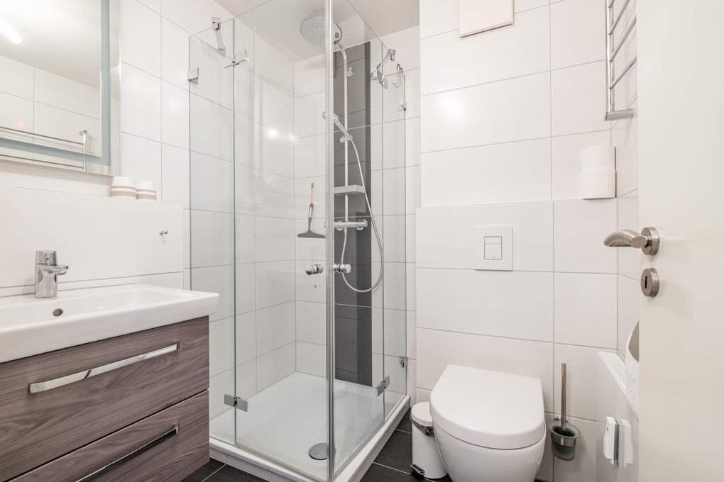 Im modernen, stilvoll designten Badezimmer erwartet Sie eine Dusche mit flachem Einstieg und WC.