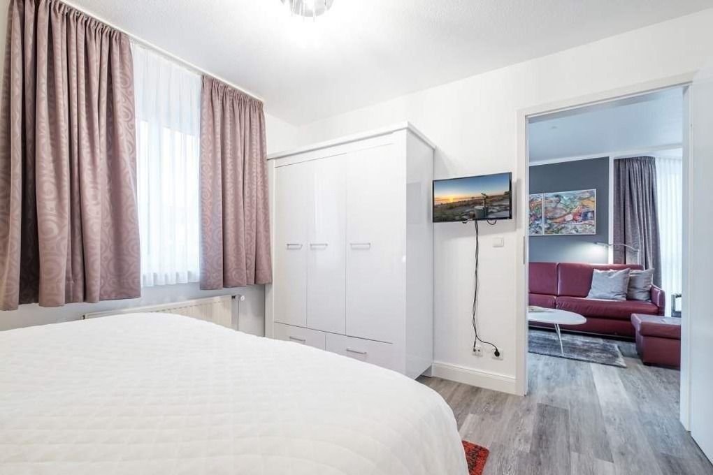 Das separate Schlafzimmer der Scharbeutz Ferienwohnung ist mit einem Doppelbett (160x200 cm, 2 einzelne Matratzen), einem 2. Flatscreen-TV und einem Kleiderschrank eingerichtet. Um Ihnen einen erholsamen Schlaf zu garantieren, lassen sich die Wohn- und Schlafräume der Ferienwohnung mittels Verdunkelungsgardinen abdunkeln.