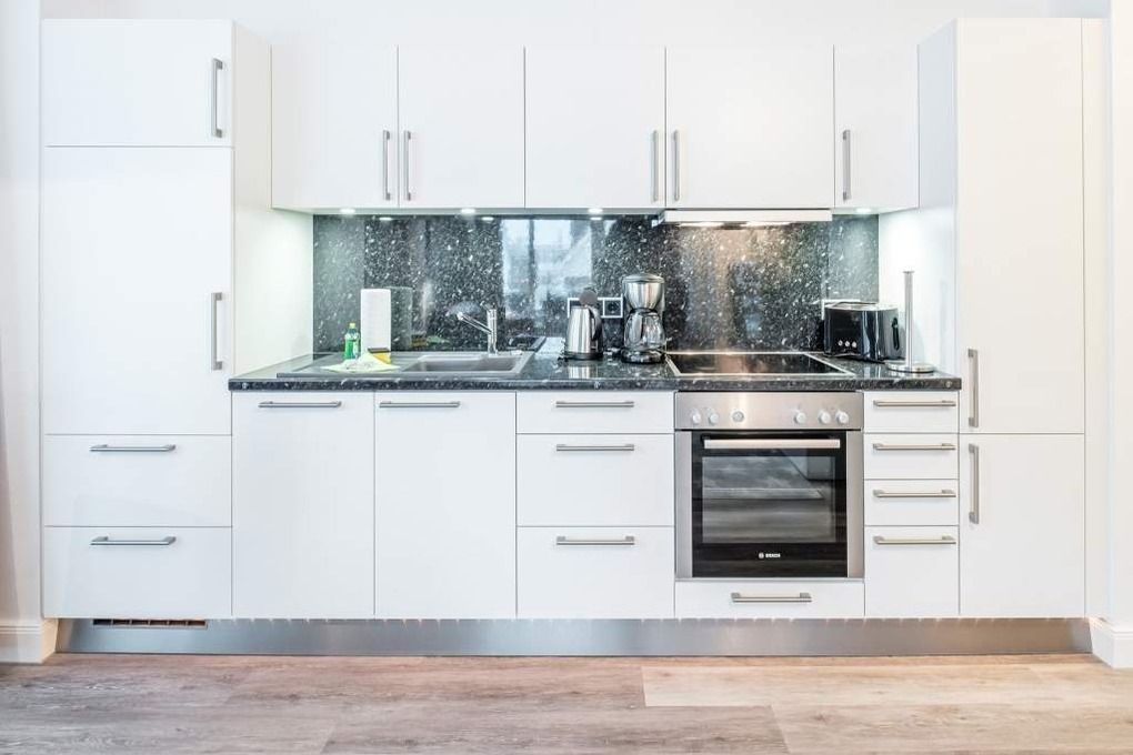 Die Ferienwohnung selbst befindet sich in der 2. Etage des Hauses, welche Sie bequem mittels Fahrstuhl erreichen können. Das Wohnzimmer verfügt über eine bequeme Couchgarnitur mit Ausziehfunktion (Liegefläche von 160x200cm mit richtiger Matratze und Lattenrost), sowie einen Flatscreen-TV, einen freundlichen Essbereich und eine komplett eingerichtete, offene Küche mit Cerankochfeld, Backofen und Geschirrspüler. Darüber hinaus finden Sie eine Filter Kaffeemaschine, Wasserkocher und Toaster vor.