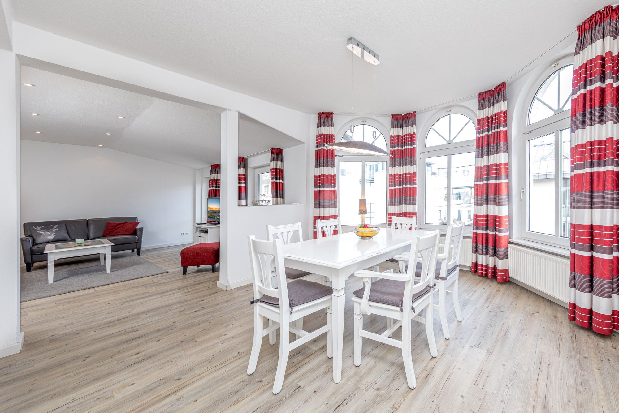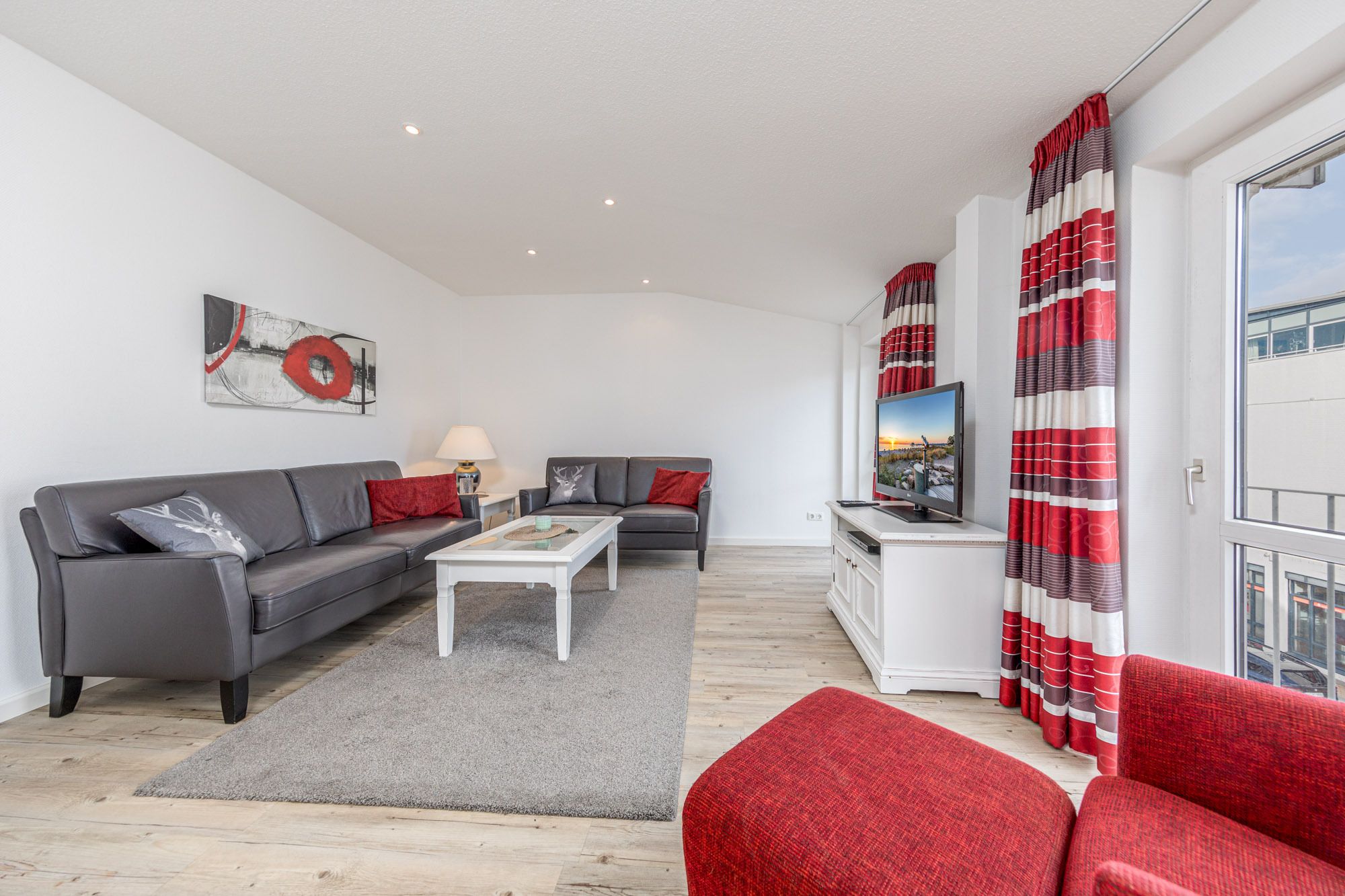 Diese komplett renovierte und zeitgemäß eingerichtete Timmendorfer Strand Ferienwohnung ist 110qm groß, liegt in der 2.Etage mit großem Balkon in Süd-/Westlage und ist für maximal 4 Personen ausgestattet. Die Ferienwohnung verfügt über ein großes Wohnzimmer mit Couchgarnitur, Flatscreen-TV und Essecke im Erker, ein großes Badezimmer mit Eckbadewanne und Dusche, ein Gäste-WC, die separate und komplett eingerichtete Küche mit Cerankochfeld, Backofen, Mikrowelle und Geschirrspüler und die großzügige Diele. Die beiden separaten Schlafzimmer dieser Ferienwohnung sind jeweils mit einem Doppelbett (180x200cm) eingerichtet. Das Schlafzimmer I verfügt zusätzlich über einen Flatscreen-TV. Der große und möblierte Balkon in Süd-Westlage runden diese sehr moderne Ferienwohnung Timmendorfer Strand ab.