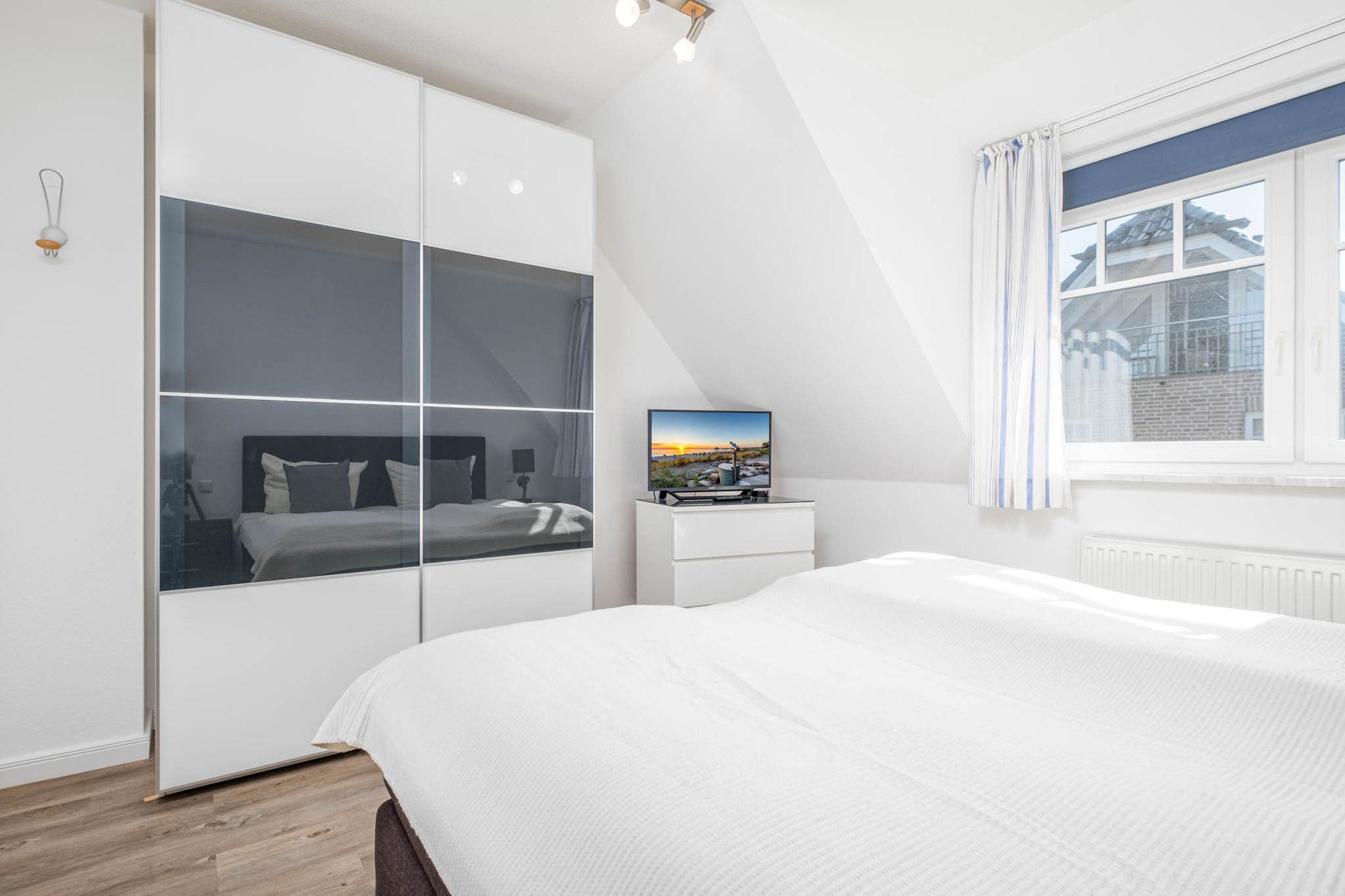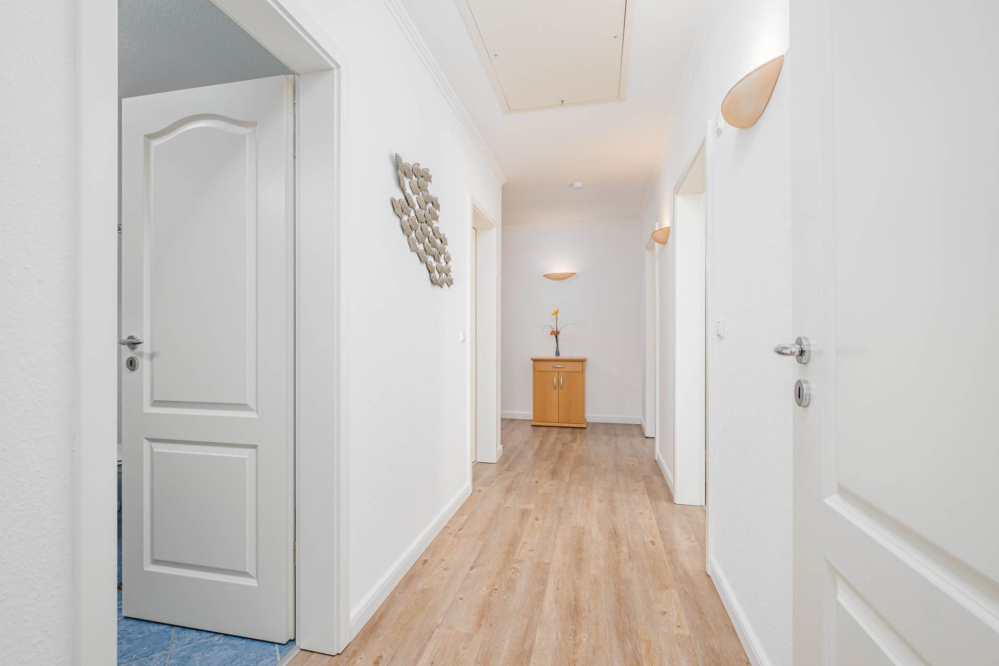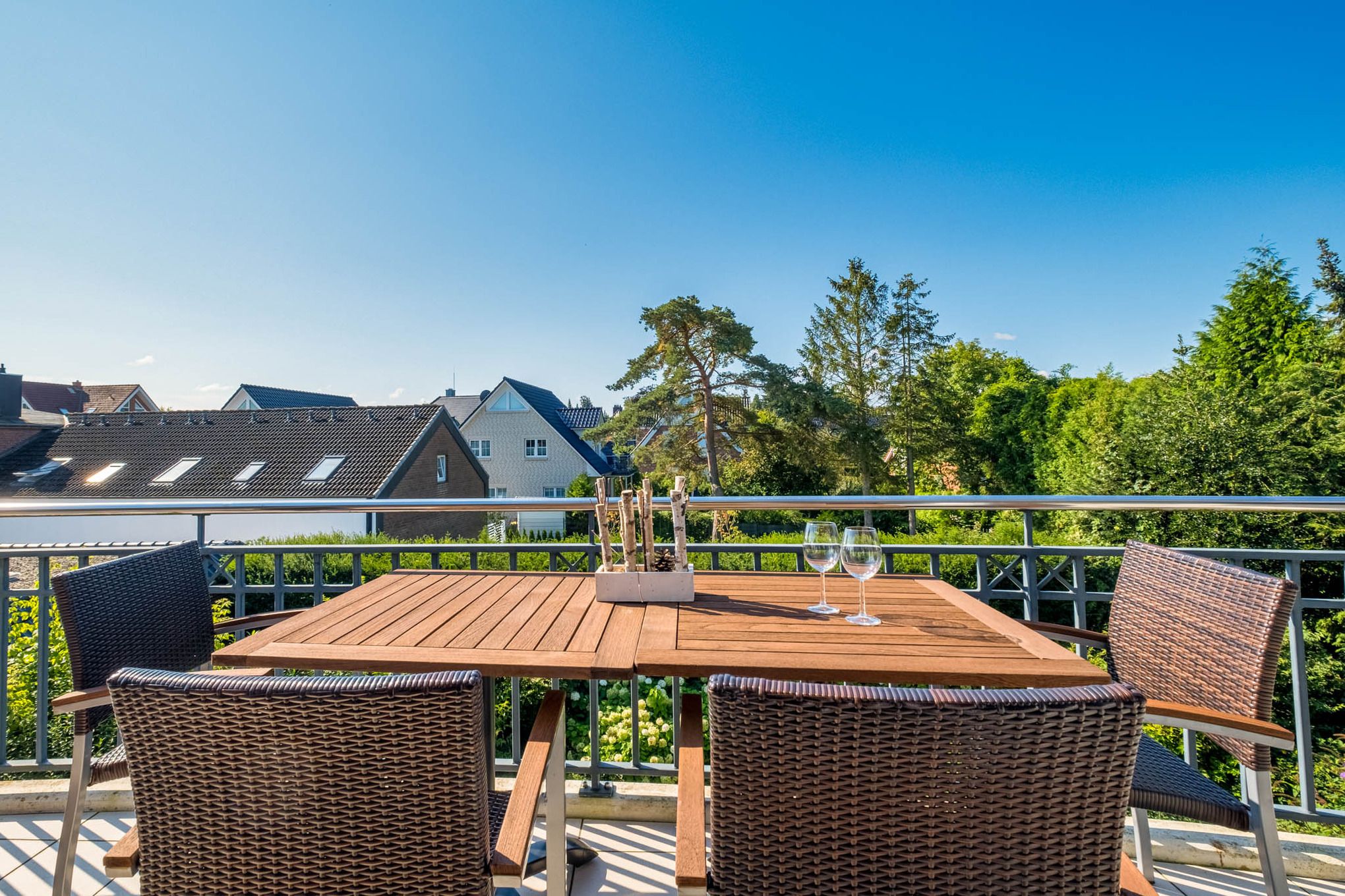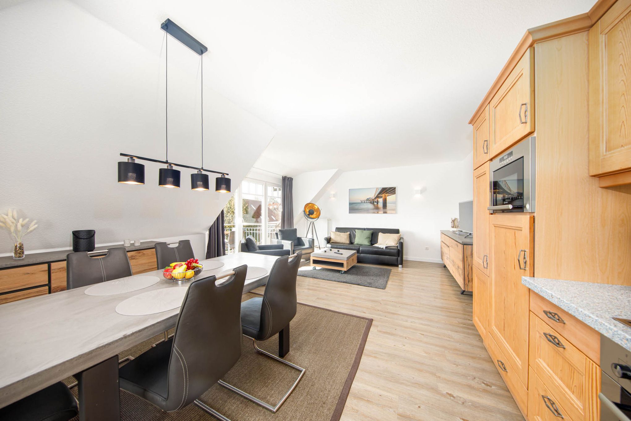 Bei der Timmendorfer Strand Ferienwohnung Nr. 5 handelt es sich um ein schönes 3-Zimmer-Appartement in der 1. Etage mit möbliertem Balkon in Süd-West-Lage und Parkettfußboden im Wohnbereich. Das Appartement erstreckt sich über eine Wohnfläche von 70qm und ist für 4 Personen geeignet. Die Ferienwohnung Timmendorfer Strand verfügt über einen Wohnbereich mit Ledercouchgarnitur, Flat Screen TV, Apple TV und Bose SoundTouch Anlage sowie einer gemütlichen Essecke. Die offene, angrenzende Pinienholz-Einbauküche verfügt über Ceranfeld, Backofen, Mikrowelle und Geschirrspüler. Zudem sind alle weiteren, notwendigen Küchenutensilien vorhanden. Das Schlafzimmer I wurde mit einem komfortablen Boxspringbett (180x200cm) ausgestattet. Das Schlafzimmer II verfügt über 2 Einzelbetten (90x200cm), darüber hinaus steht Ihnen in jedem Schlafzimmer ein zusätzlicher Flat Screen TV zur Verfügung. Ein Bad mit ebenerdiger Dusche und Bidet ist vorhanden. Zusätzlich steht Ihnen auch ein Gäste-WC zur Verfügung.