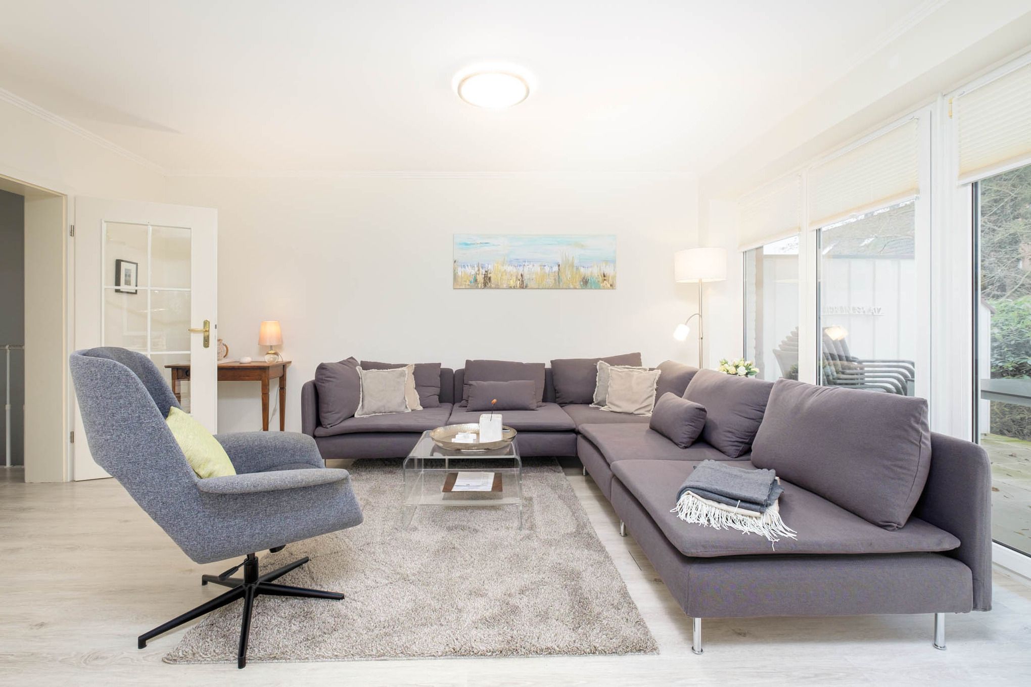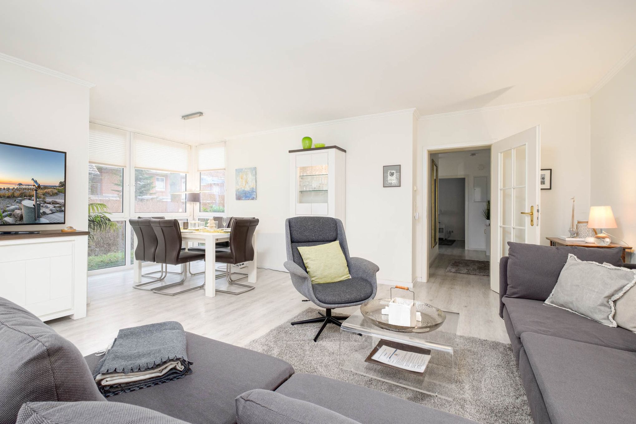 Das Wohnzimmer ist mit einer modernen Couch, Flatscreen-TV, DVD-Player, Stereo-Anlage und einer gemütlichen Essecke eingerichtet. Die separate Küche ist mit den modernsten Geräten, Cerankochfeld, Backofen, Mikrowelle und Geschirrspüler ausgestattet.