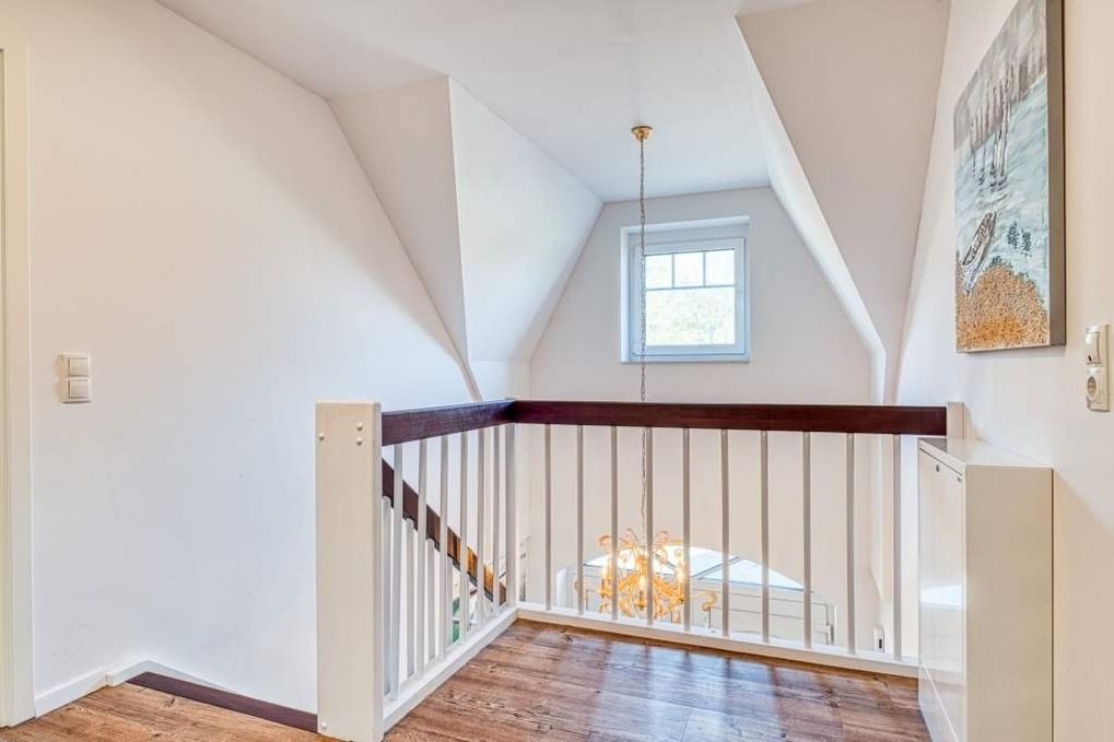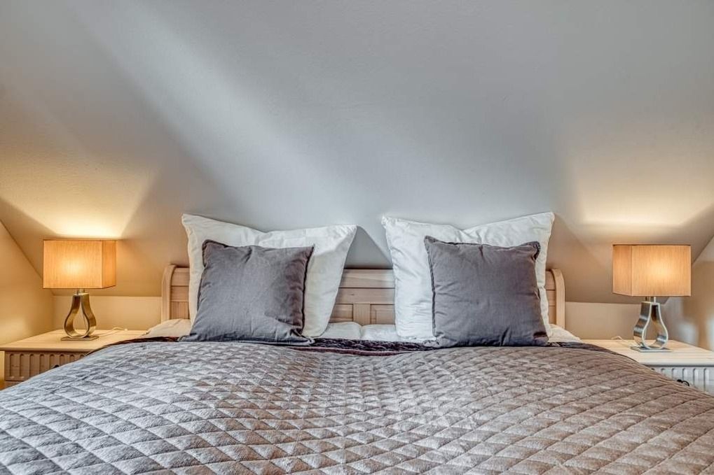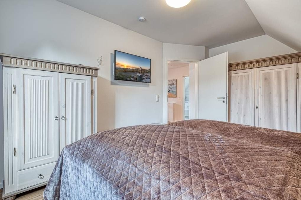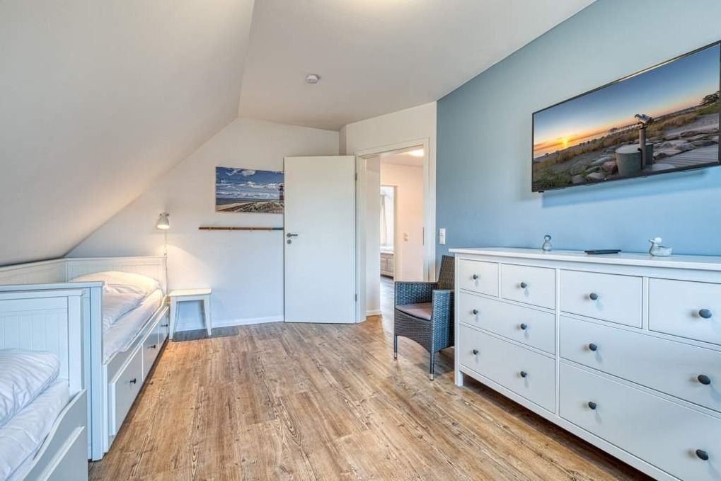 Im ersten Obergeschoss, das Sie über die toll gestaltete Diele erreichen, befinden sich die drei separaten Schlafzimmer. Zwei davon sind jeweils mit einem Doppelbett ausgestattet, eines mit zwei komfortablen Einzelbetten. In dem einen Schlafzimmer mit Doppelbett sowie in dem mit den Einzelbetten steht Ihnen darüber hinaus ein weiterer Flachbild-TV zur Verfügung.