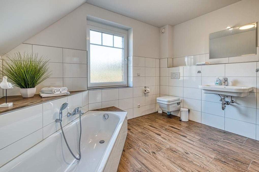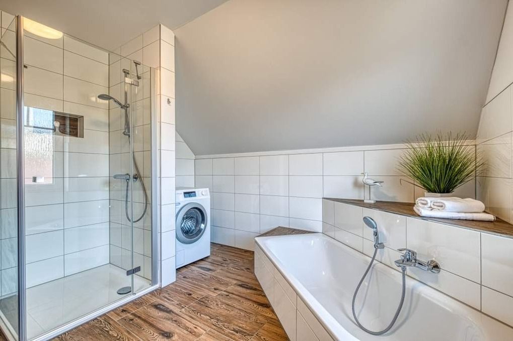 Auch das große Badezimmer mit ebenerdiger Dusche, Badewanne und Waschmaschine befindet sich auf der ersten Etage des Ferienhauses 'Der kleine Friese'.