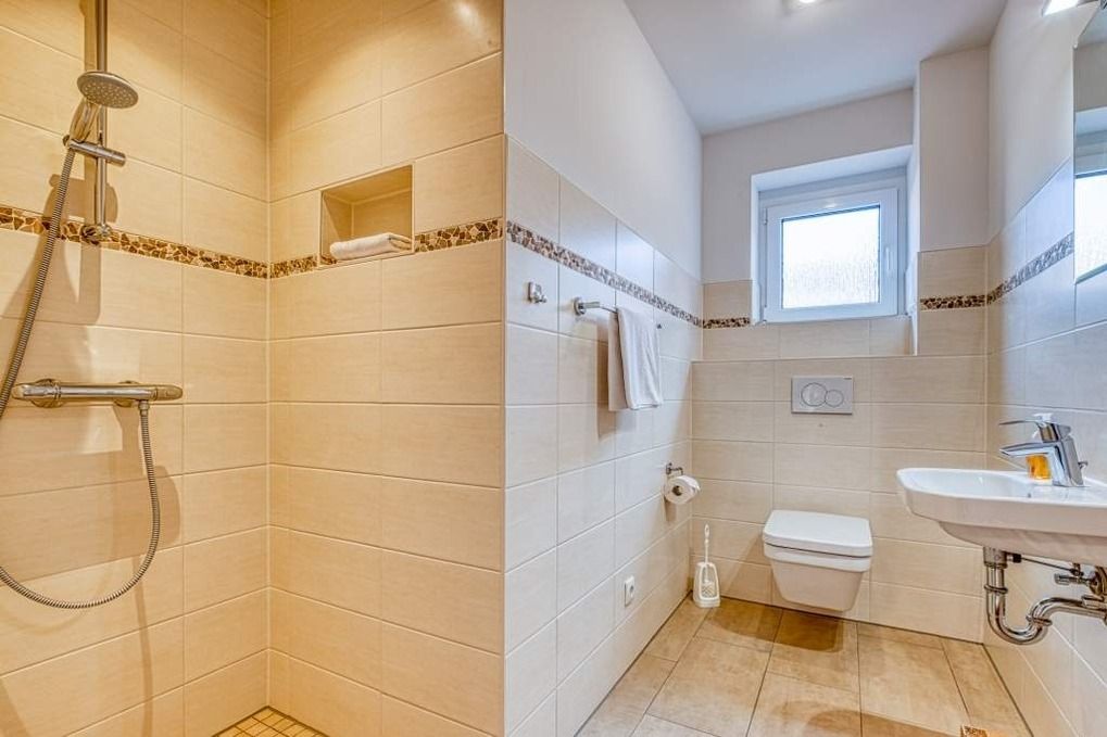 Im Erdgeschoss des idyllischen Friesenhauses befindet sich zudem das Gäste WC, wobei es sich hierbei um ein Bad mit WC und Dusche handelt. Demnach ein zweites Badezimmer.