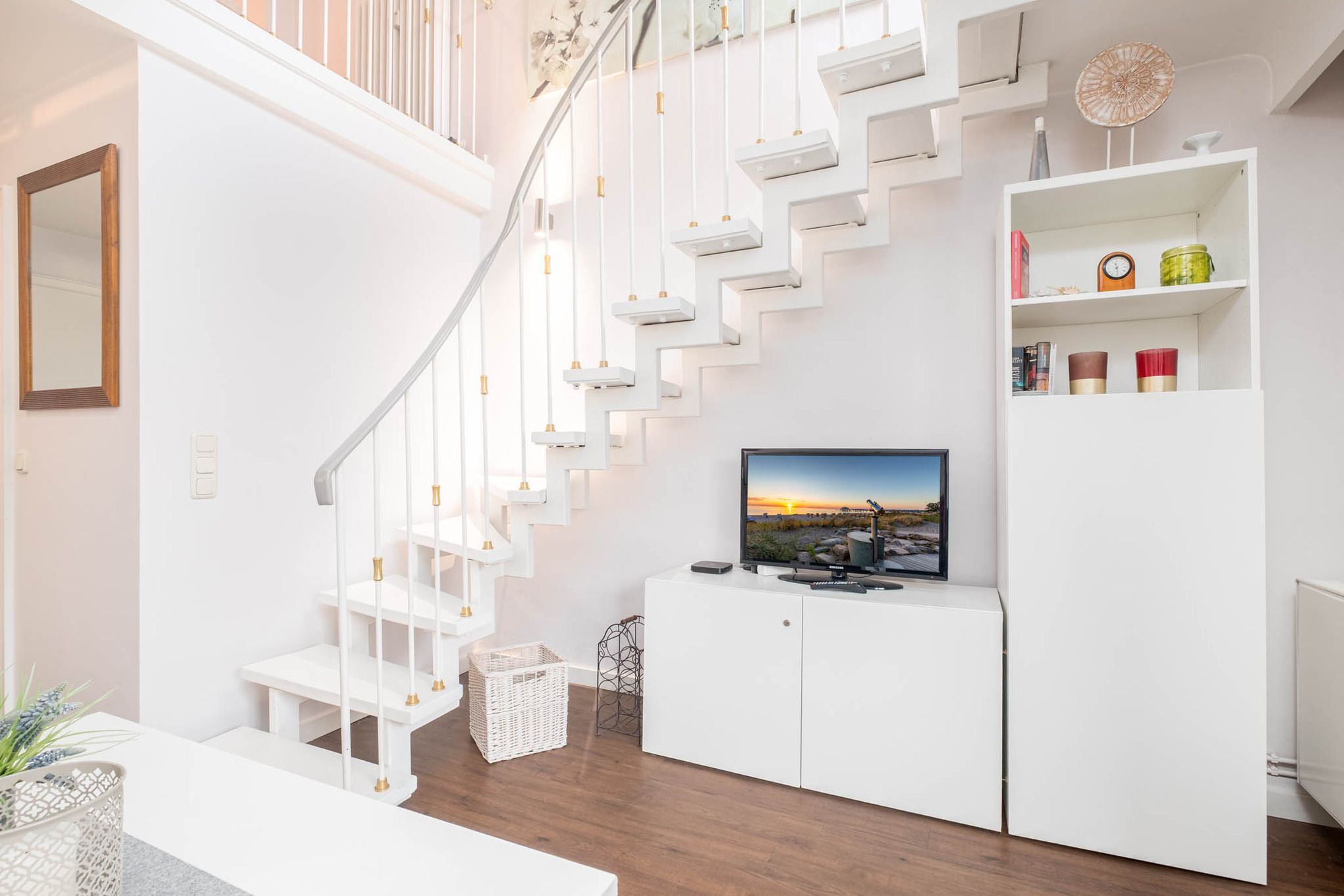 Das Ostsee Appartement Miramar liegt im Erdgeschoss mit Terrasse in Süd-/Westlage. Die Ferienwohnung geht über 2 Ebenen. Im Erdgeschoss erwartet Sie das Wohnzimmer mit Couchgarnitur, Flatscreen-TV und dem Küchenbereich. In der kleinen Küche steht Ihnen ein Zwei-Platte-Cerankochfeld zur Verfügung. Ebenfalls ist auf dieser Ebene das Badezimmer mit Dusch-Badewanne, WC und Waschbecken. Über die Treppe im Wohnzimmer erreichen Sie den offenen Maisonettebereich mit dem Schlafzimmer. Das Schlafzimmer verfügt über ein Doppelbett (180x200cm). Die möblierte Terrasse in Süd-/Westlage rundet diese wunderschöne Niendorf Ostsee Ferienwohnung ab.