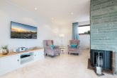 Das Wohnzimmer verfügt über einen gemütlichen Couchbereich mit Kamin, zwei Sesseln und einem Flatscreen-TV. Von der Essecke aus bietet sich Ihnen ein unvergleichlicher Ausblick auf die Ostsee.