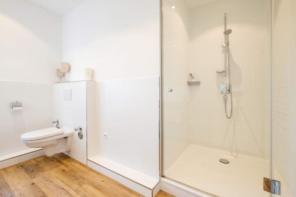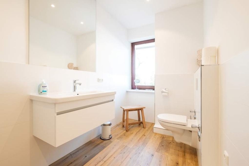 Das Badezimmer I verfügt über einen Waschtisch, ein WC und eine große ebenerdige Dusche. Zusätzlich verfügt das Ferienappartement über ein Gäste WC.