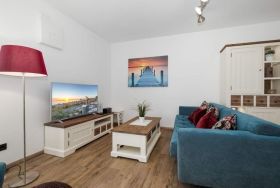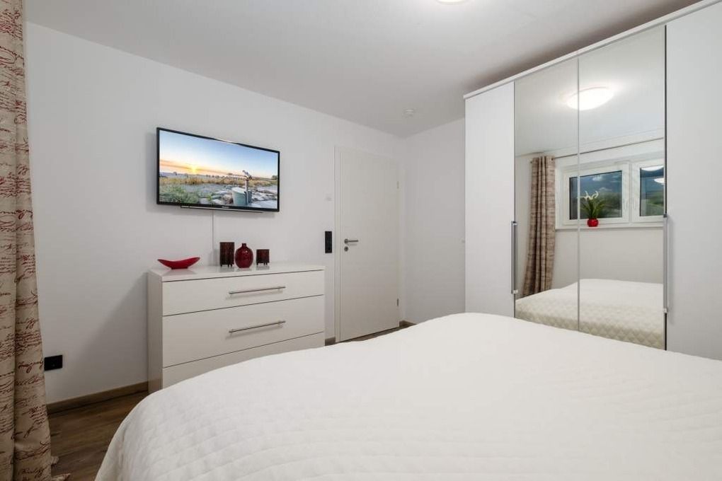 Das Schlafzimmer I befindet sich auch auf derselben Ebene und ist mit einem Doppelbett (1,80 x 2,00m, getrennte Matratzen), Kleiderschrank und Flatscreen-TV ausgestattet.