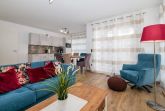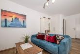 Das Herzstück des geschmackvoll und hochwertig eingerichteten Hauses bietet das moderne Wohnzimmer mit Couchgarnitur, Internetradio, Flatscreen-TV und Essbereich.