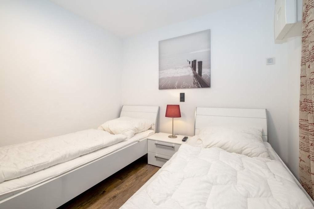 Im Untergeschoss befindet sich das zweite Schlafzimmer mit einem Doppelbett (1,80 x 2,00m, getrennte Matratzen), einem Schrank sowie einem Flatscreen-TV. Im dritten Schlafzimmer finden Sie 2 Einzelbetten (je 0,90 x 2,00m), einen Kleiderschrank und einen Flatscreen-TV vor.