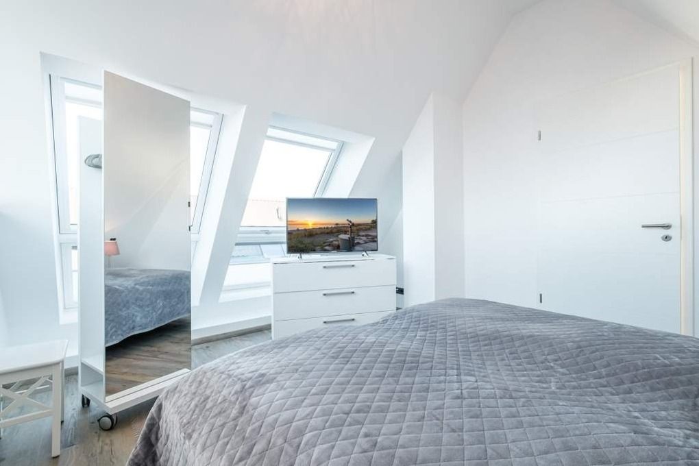 Im Dachgeschoss befindet sich das zweite Schlafzimmer mit einem Doppelbett, einem Schrank sowie einem Flatscreen-TV.