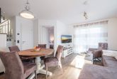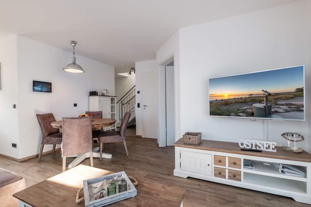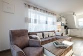 Das Herzstück des geschmackvoll und hochwertig eingerichteten Hauses bietet das moderne Wohnzimmer mit Couchgarnitur, Internetradio, Flatscreen-TV und Essbereich.