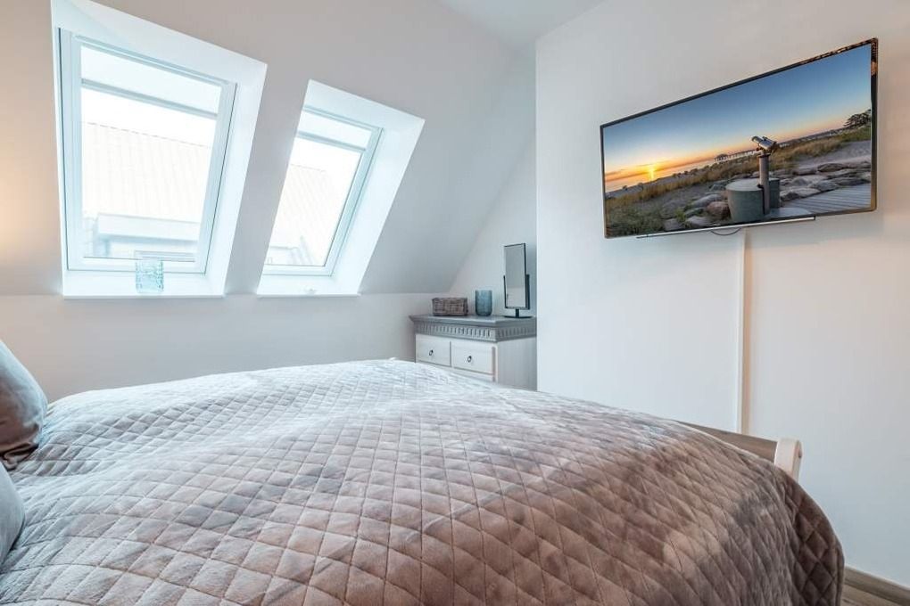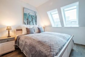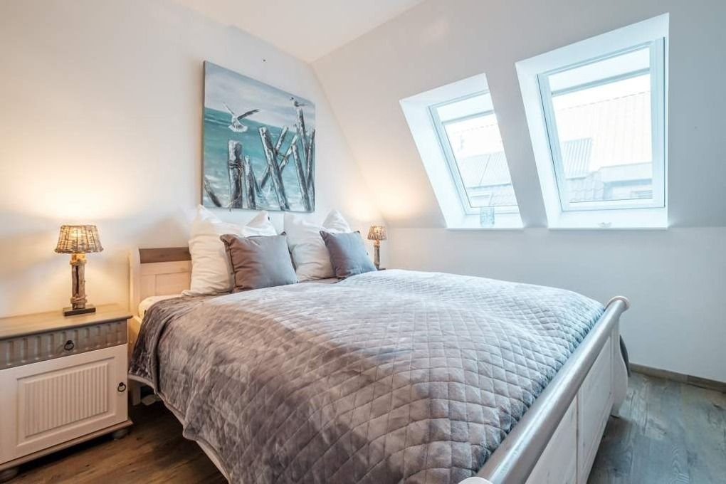 Das Schlafzimmer verfügt über zwei große Dachflächenfenster, die in Richtung Meer zeigen.