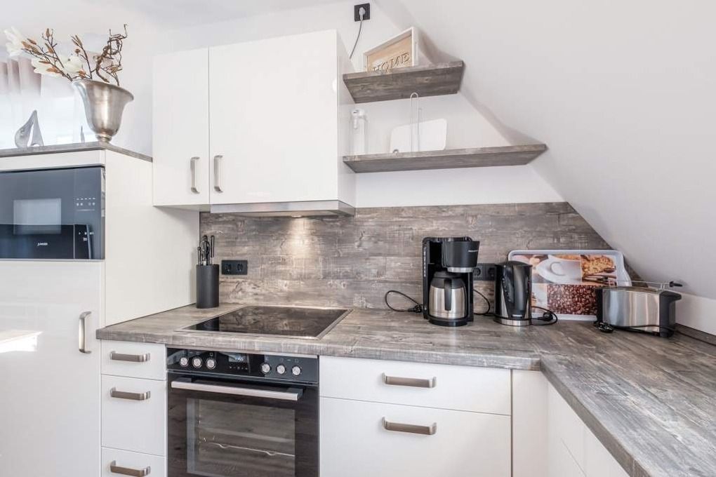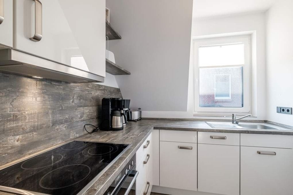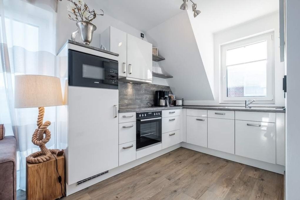 Die offene Küche ist mit allem Komfort ausgestattet u.a. sind Ceranfeld, Backofen, Mikrowelle und Geschirrspüler vorhanden.