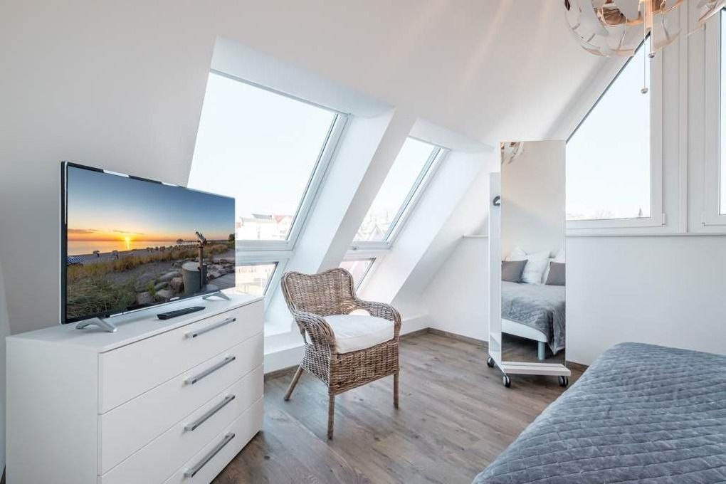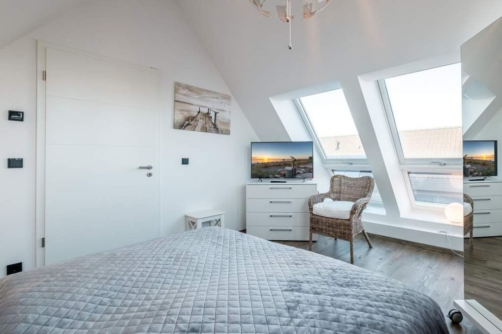 Im Dachgeschoss befindet sich das zweite Schlafzimmer mit einem Doppelbett, einem Schrank sowie einem Flatscreen-TV.