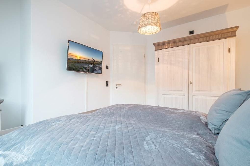 Das Schlafzimmer I befindet sich auf derselben Ebene und ist mit einem Doppelbett, Kleiderschrank und Flatscreen-TV ausgestattet.