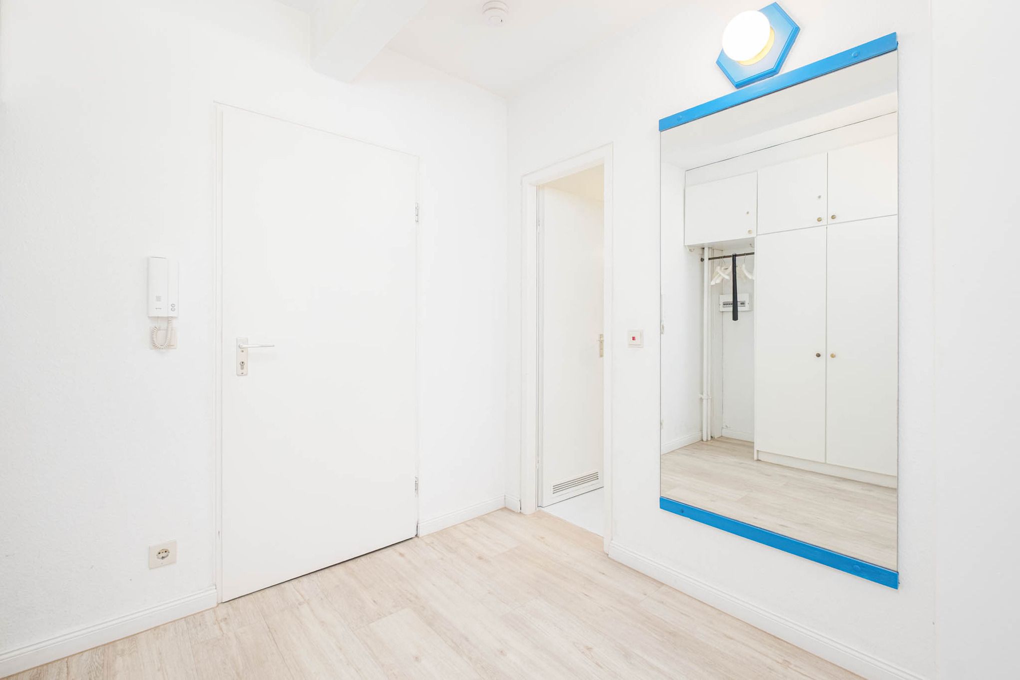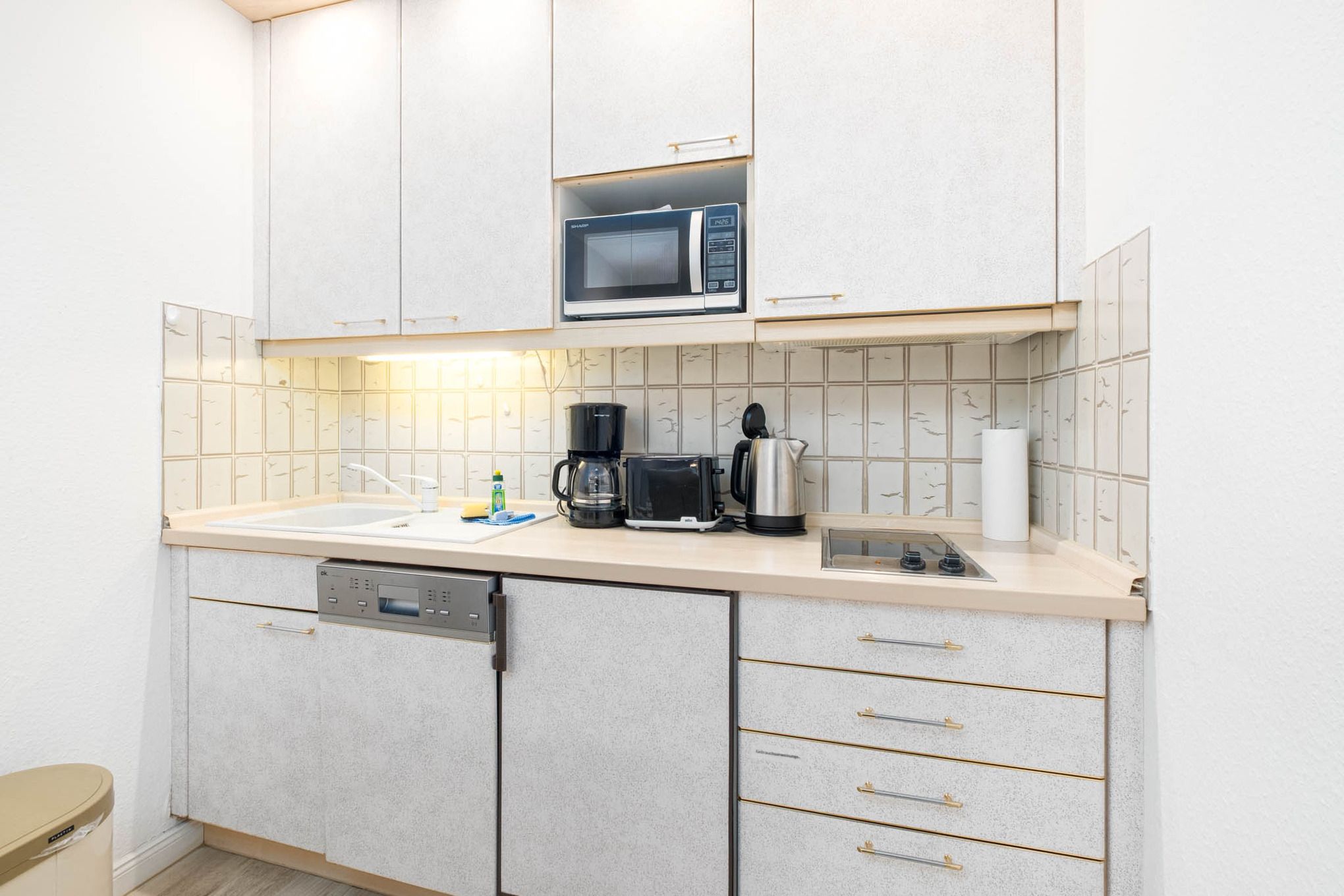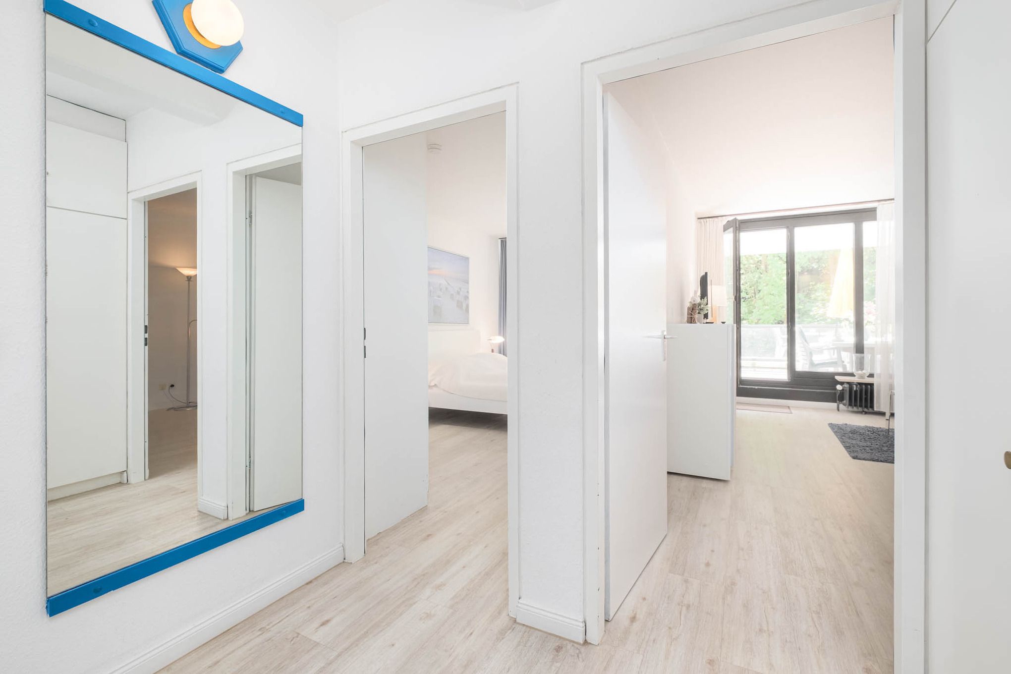 Die Ferienwohnung Timmendorfer Strand Nr. 103 liegt im Hochparterre (wie 1. Etage) und verfügt über ein Wohn-/Schlafzimmer mit einem Wandklappbett (90X200m) für eine Person, Flatscreen-TV, eine Essecke und eine moderne Küchenzeile. Zudem kann eine Person auf der Couch im Wohnbereich schlafen.