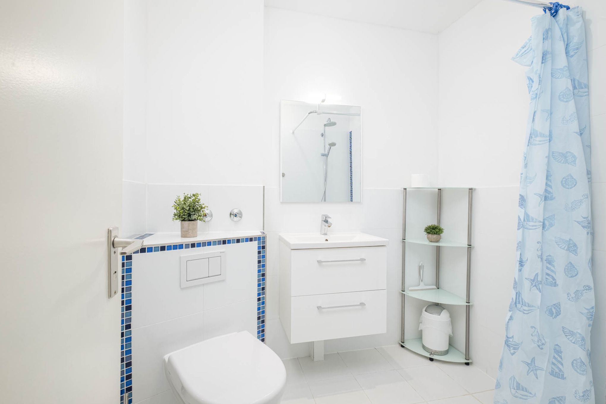 Das Badezimmer verfügt über eine ebenerdige Regendusche.