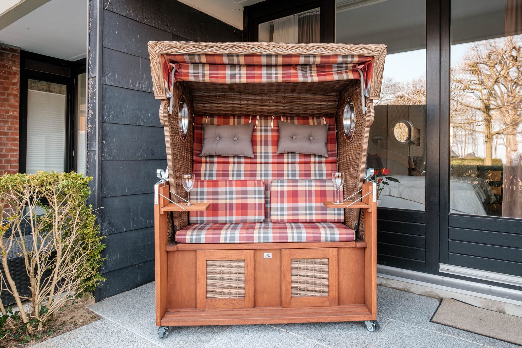 Die möblierte Terrasse mit Meerblick, Strandkorb und einer Sonnenliege rundet diese komfortable Ferienwohnung in Timmendorfer Strand an der Ostsee ab.
