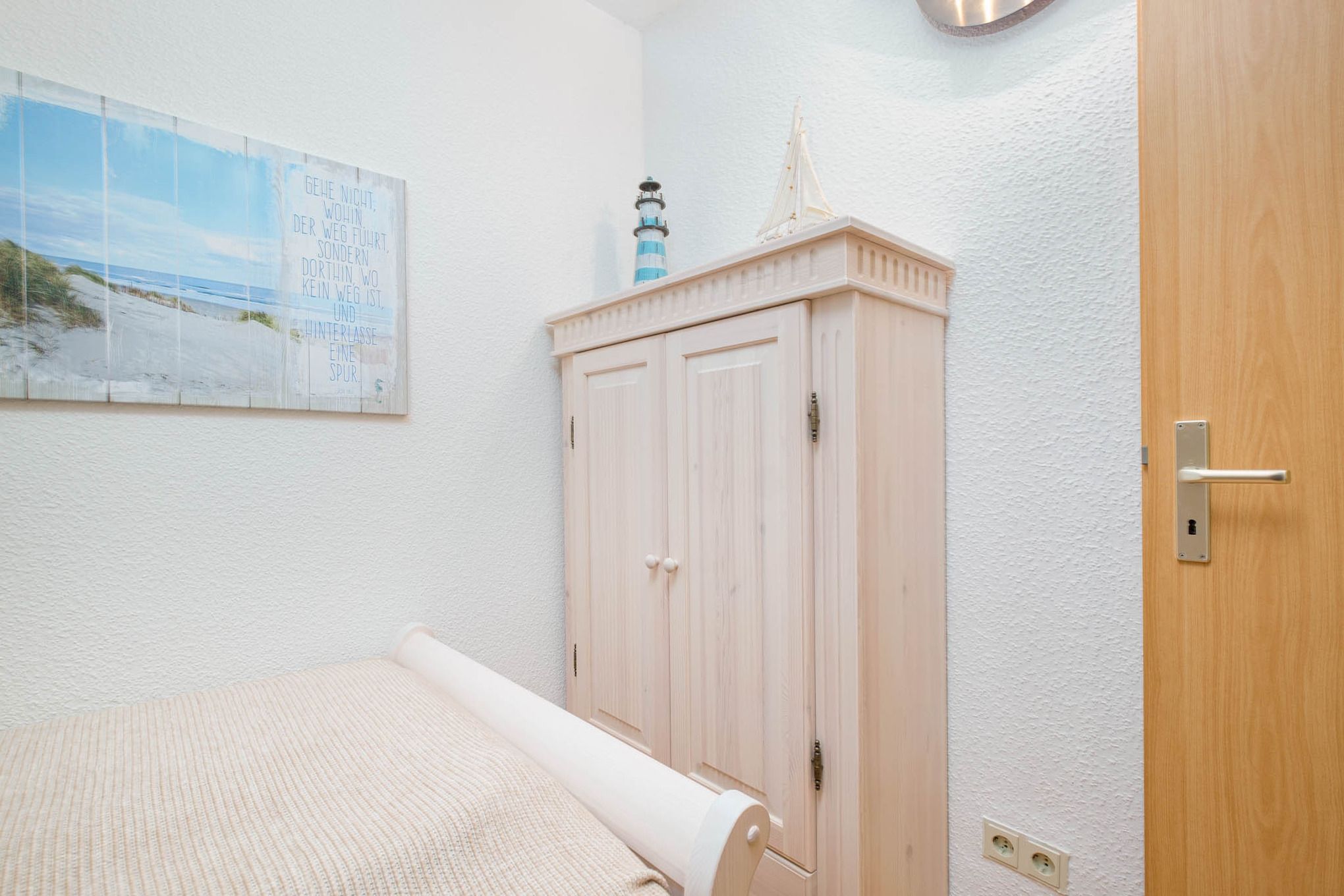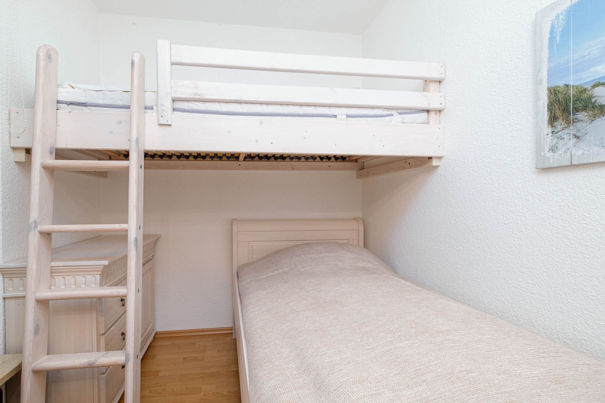 Das kleine separate Schlafzimmer ist mit einem Hochbett (90x200cm) und einem Einzelbett (90x200cm) eingerichtet. Bitte beachten Sie das maximal Gewicht von 50kg auf dem Hochbett. Das Badezimmer verfügt neben WC und Waschbecken über eine ebenerdige Dusche. Die wunderschöne und möblierte Terrasse rundet diese gemütliche Timmendorfer Strand Ferienwohnung ab.