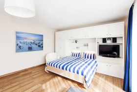 Diese geräumigen Ferienwohnungen mit ca. 55 m² sind für 2 bis 4 Personen vorgesehen. Sie umfassen jeweils ein Schlafzimmer mit zwei Einzelbetten oder einem Doppelbett, eine voll ausgestattete Küche mit Essplatz, sowie ein Badezimmer mit Dusche und WC. Hinzu kommt ein Wohnzimmer mit ausklappbarem Doppelbett, sowie einer gemütlichen Sofaecke zum Lesen oder Fernsehen. Zu jeder dieser Ferienwohnungen gehört entweder eine Terrasse oder ein Balkon.