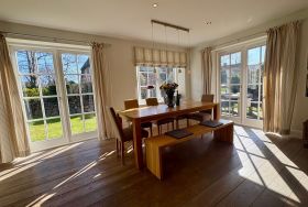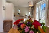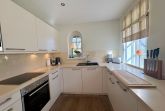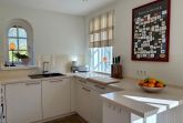 Die offene, modern ausgestattete Küche ist das Herzstück des Hauses. Der großzügige, lichtdurchflutete Raum mit großen Fenstern sorgt nicht nur für eine freundliche Atmosphäre, sondern bietet auch direkten Zugang zur Terrasse – ideal für Frühstück im Freien oder gesellige Sommerabende. Der große Esstisch für bis zu acht Personen lädt zu gemeinsamen Kochabenden, ausgiebigen Mahlzeiten und gemütlichem Beisammensein ein. Hochwertige Geräte, großzügige Arbeitsflächen und liebevolle Details machen das Kochen hier zum echten Vergnügen.