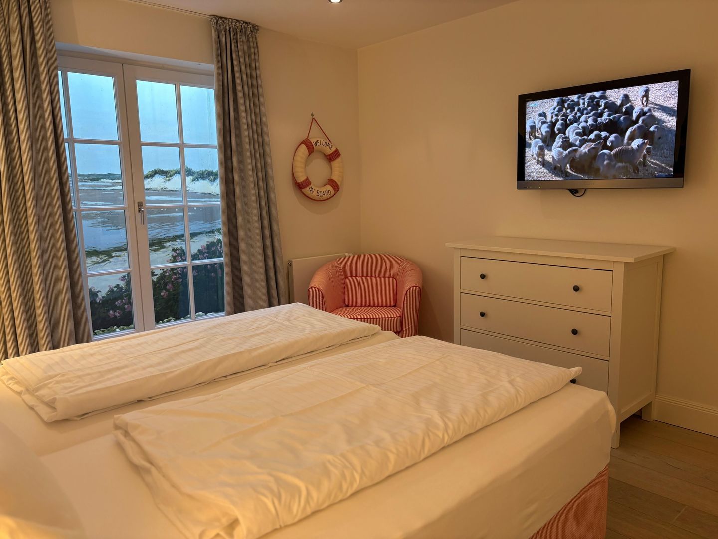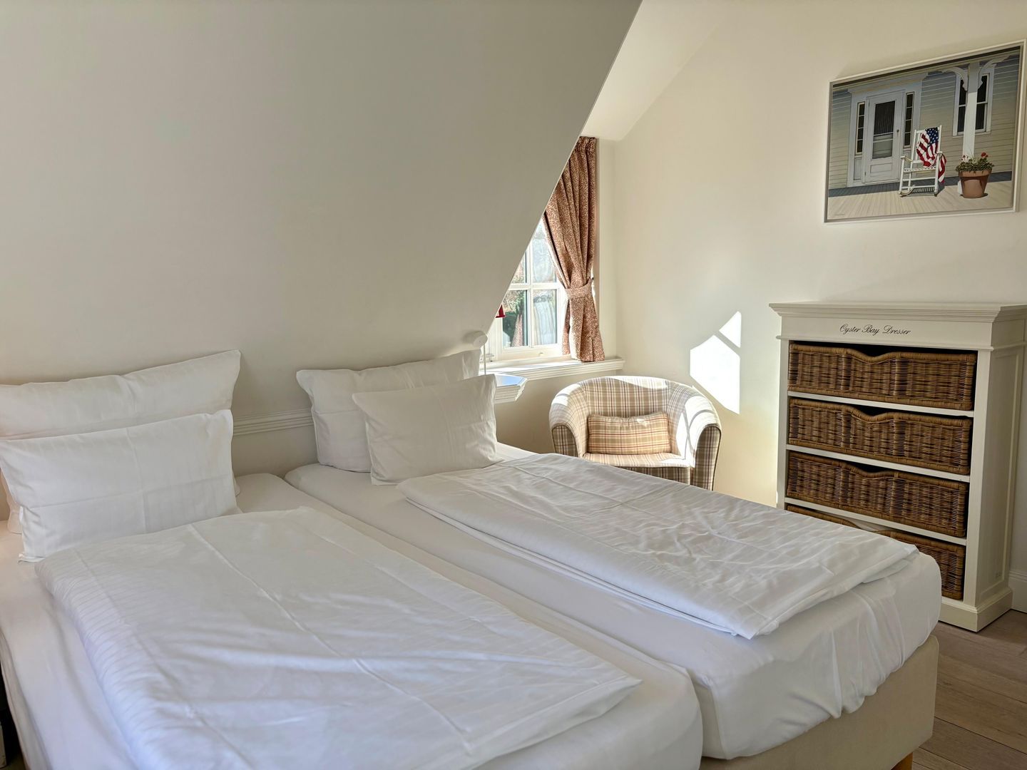 Auch das Untergeschoss überrascht mit Behaglichkeit: Zwei hübsche Doppelschlafzimmer, viel Stauraum in den Einbauschränken und ein geräumiges Duschbad bieten ausreichend Platz für Familie und Gäste. Das besondere Highlight ist die Dampfsauna – perfektes Syltfeeling und pure Entspannung, ganz unabhängig vom Wetter.