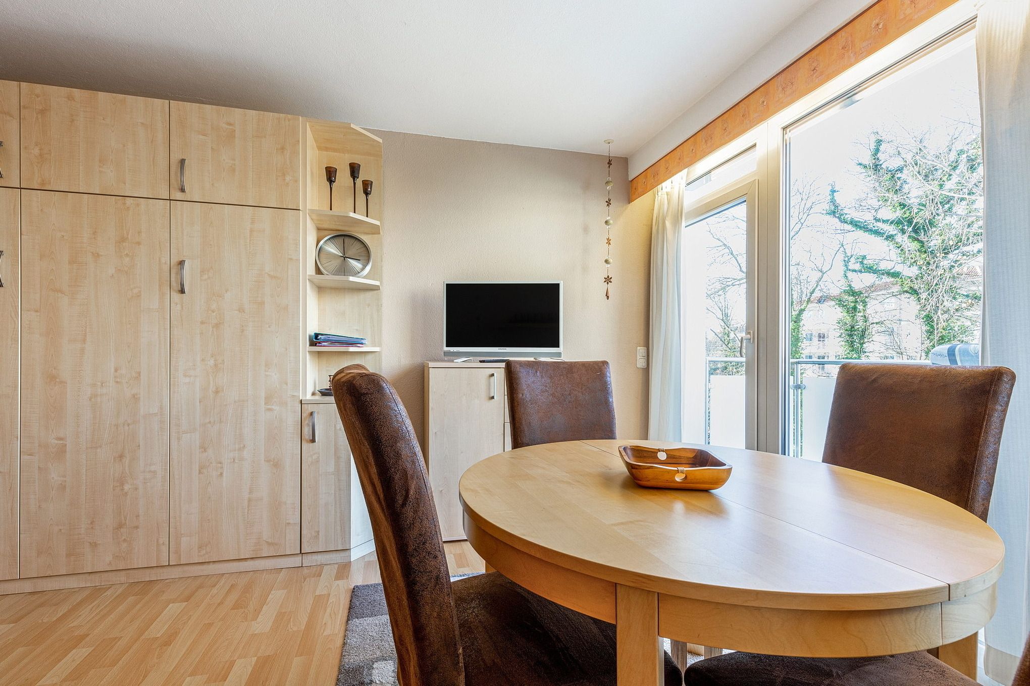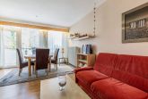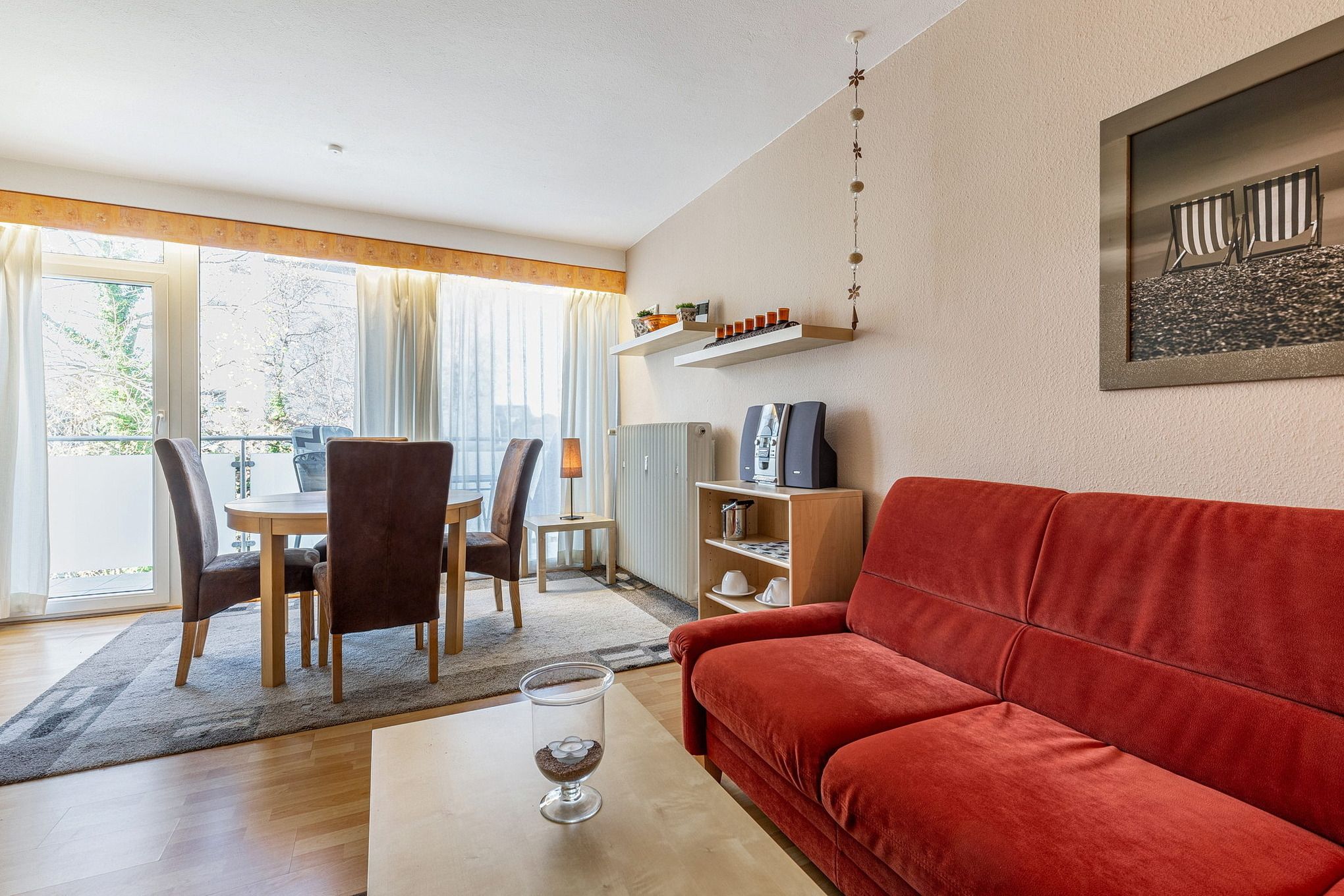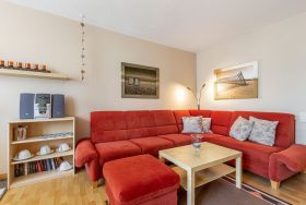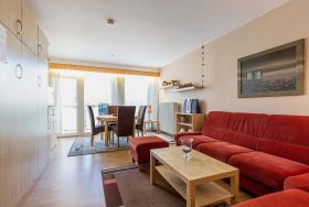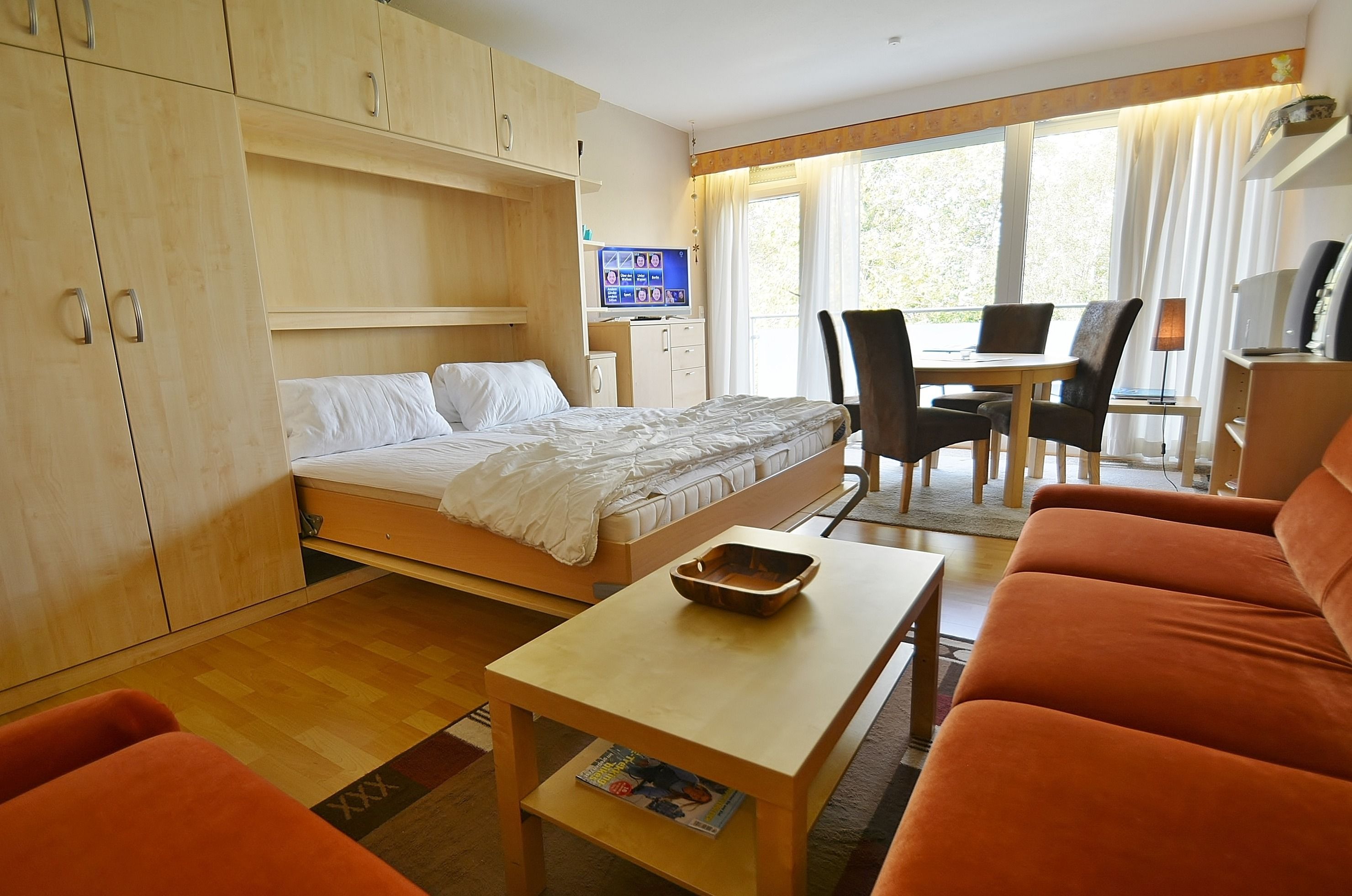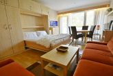 Das freundliche, modern eingerichtete Wohn- und Schlafzimmer mit direktem Zugang zum Balkon ist mit einem Essplatz für 4 Personen, einer Eckcouch, einem Couchtisch, einer Kommode und einem Schrankbett (2x 80x200cm) ausgestattet. Zur Unterhaltung stehen ein Fernseher und eine Mini-Stereoanlage mit CD-Player zur Verfügung. Das Zimmer ist mit Laminatboden ausgelegt und lässt sich durch ein elektrisches Außenrollo vollständig verdunkeln.