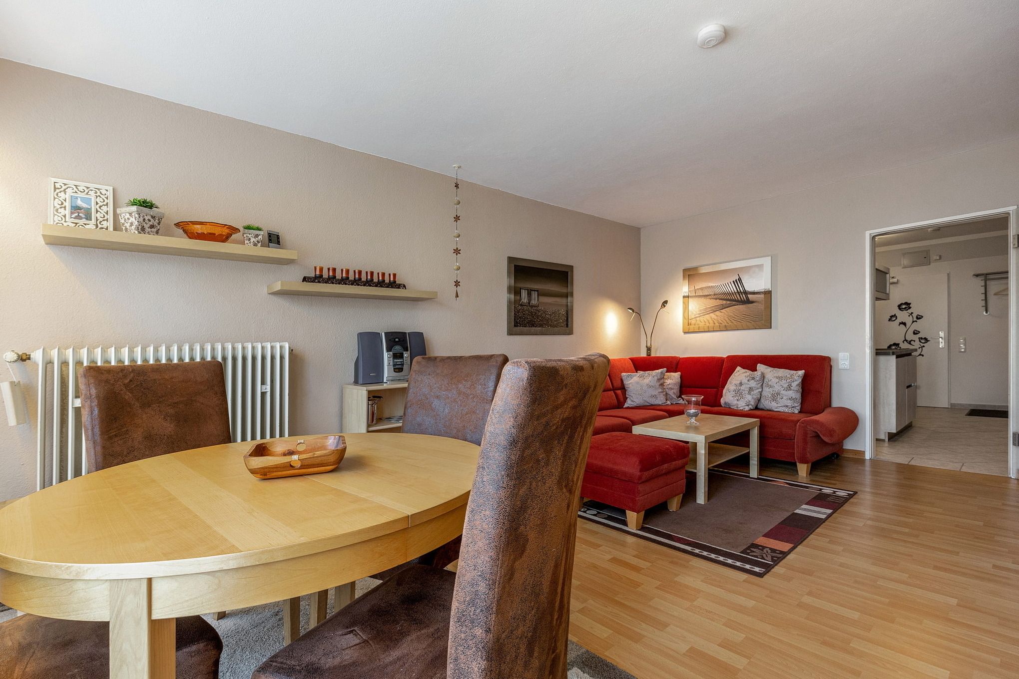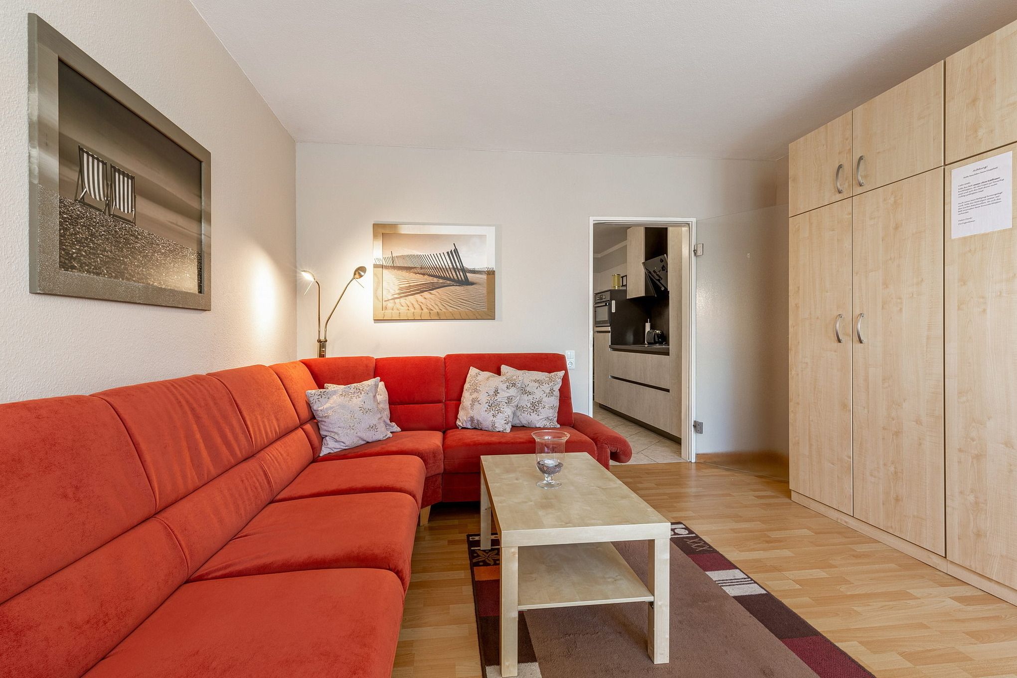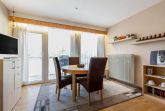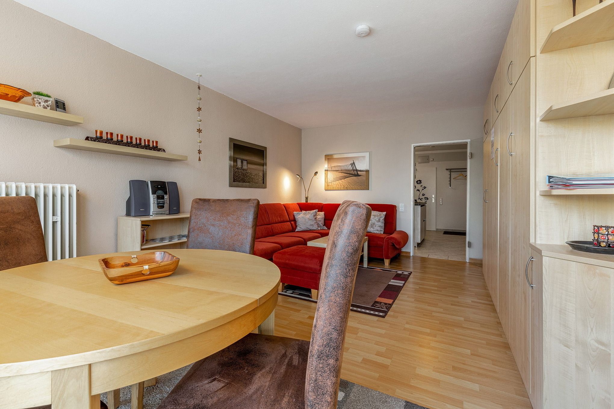 Das freundliche, modern eingerichtete Wohn- und Schlafzimmer mit direktem Zugang zum Balkon ist mit einem Essplatz für 4 Personen, einer Eckcouch, einem Couchtisch, einer Kommode und einem Schrankbett (2x 80x200cm) ausgestattet. Zur Unterhaltung stehen ein Fernseher und eine Mini-Stereoanlage mit CD-Player zur Verfügung. Das Zimmer ist mit Laminatboden ausgelegt und lässt sich durch ein elektrisches Außenrollo vollständig verdunkeln.