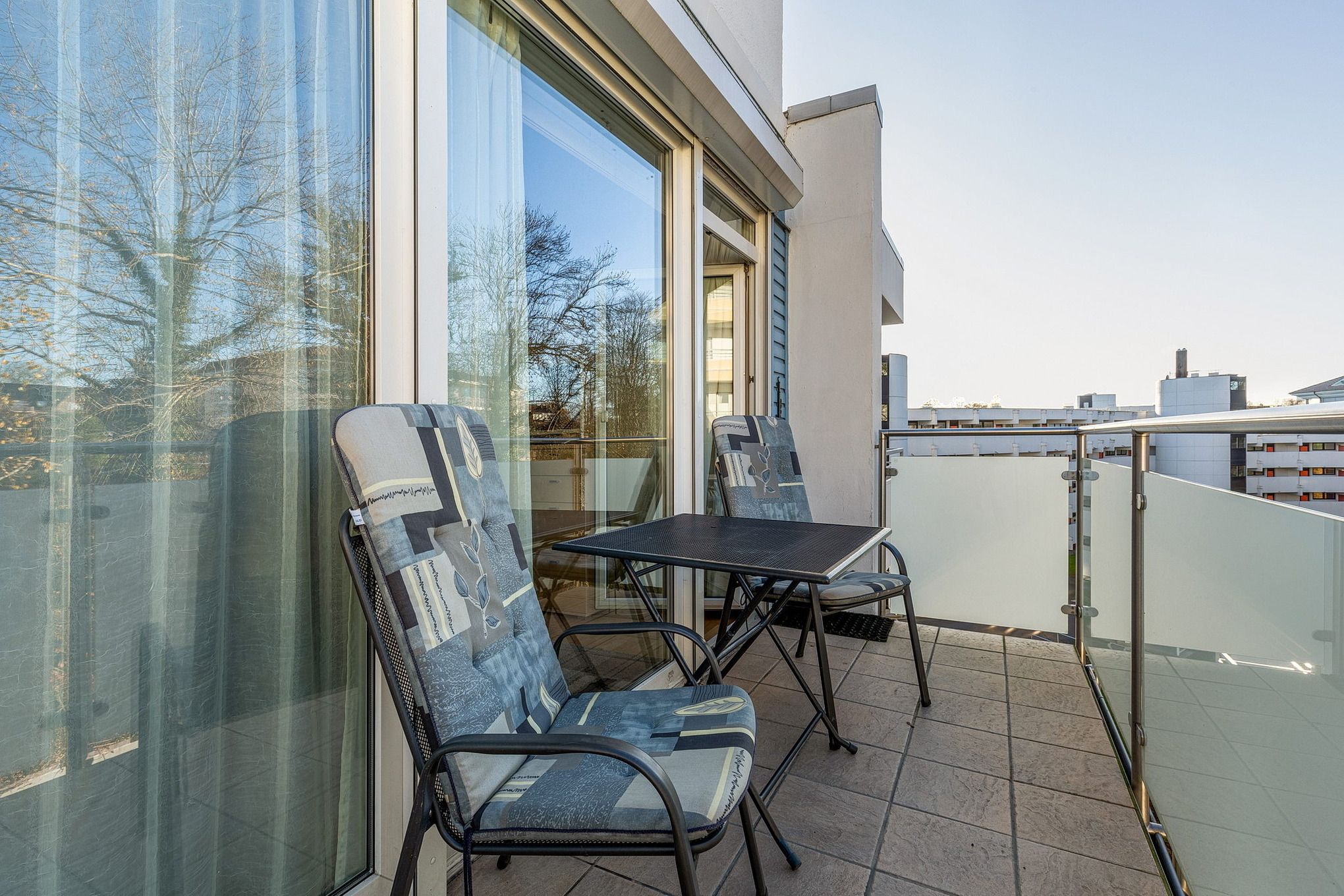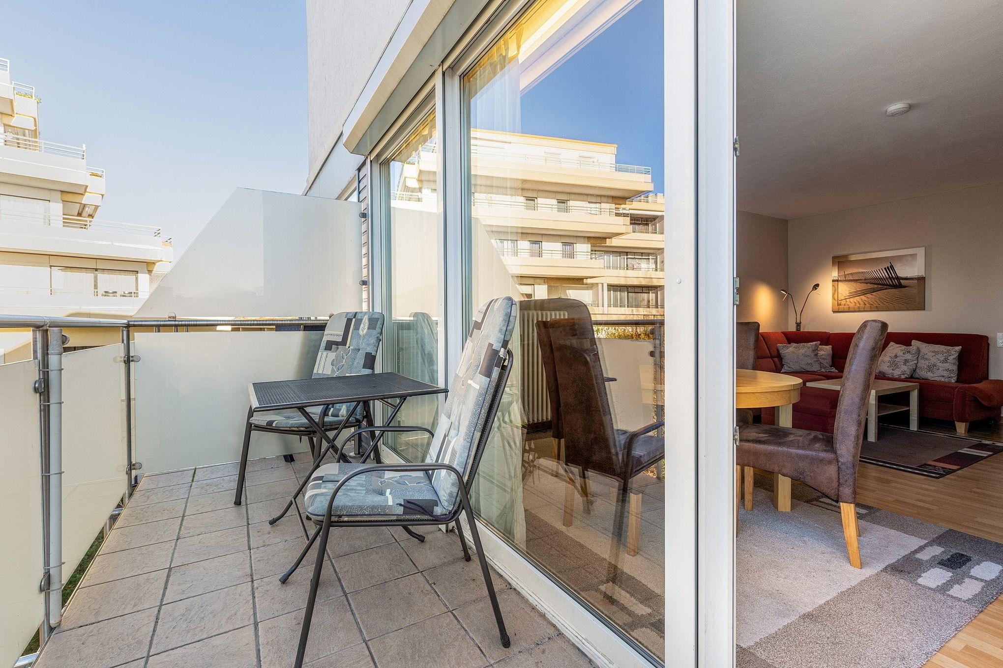 Balkon in westliche Richtung, eigener Pkw-Stellplatz direkt hinter dem Gebäude (sehr schmal), Waschmaschine, Trockner und Sauna gegen Gebühr, Fahrstuhl vorhanden.