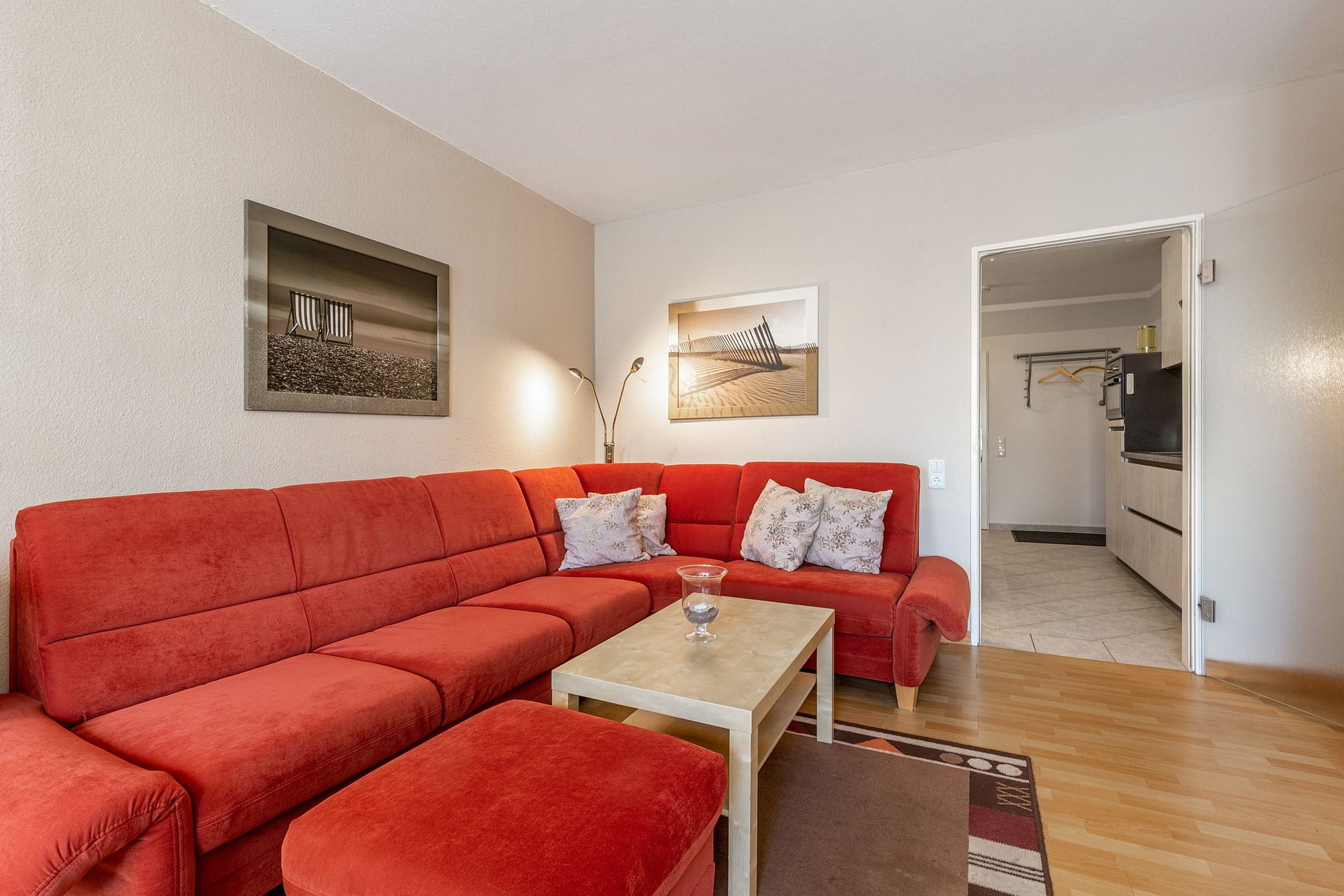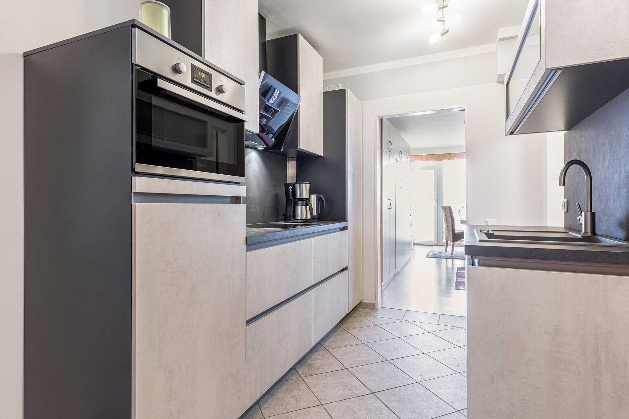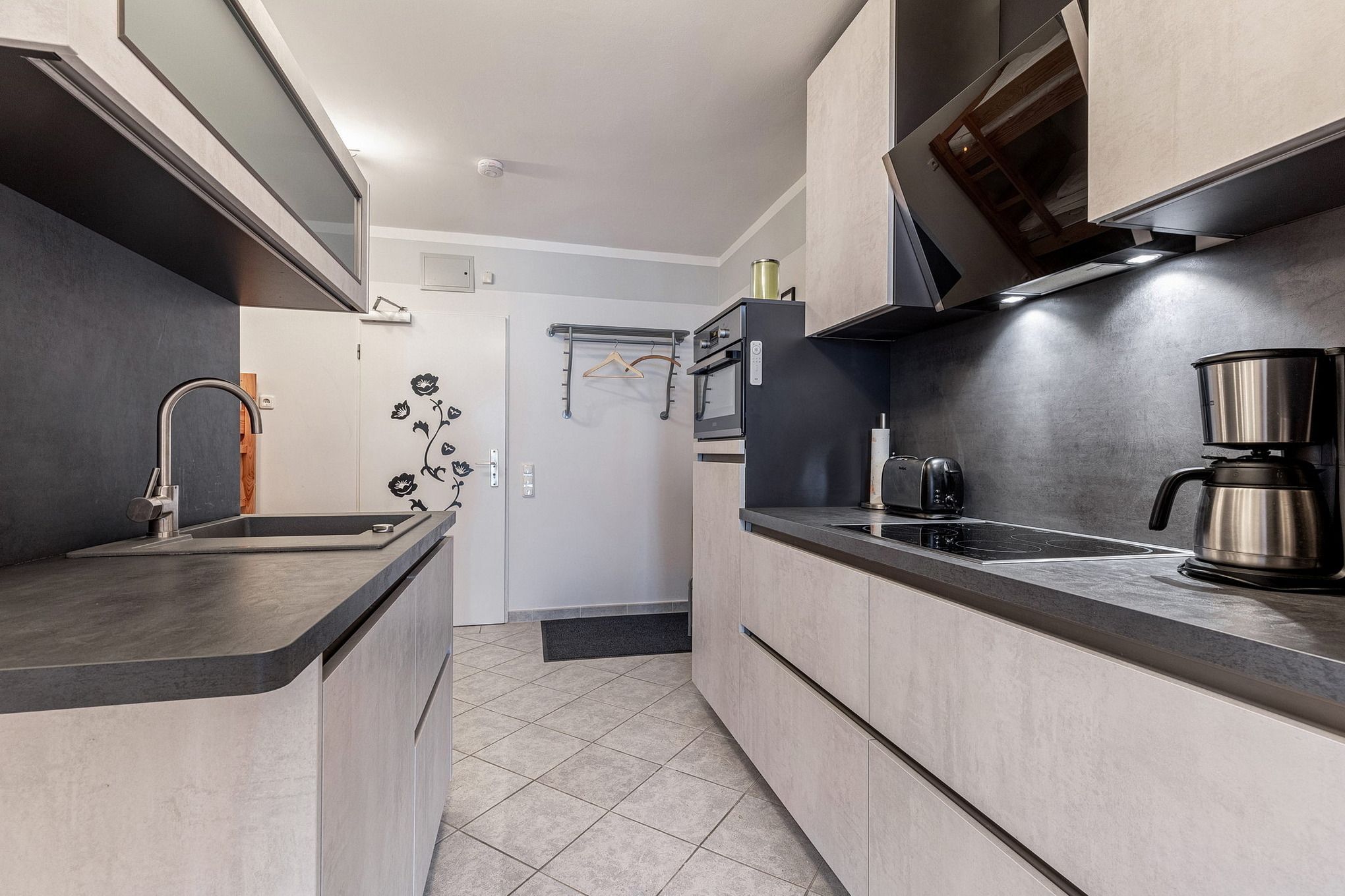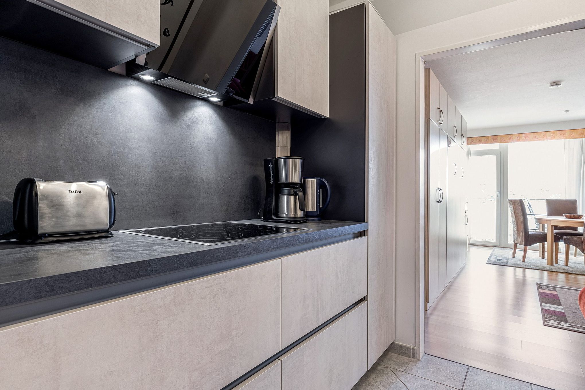 Moderne, komplett eingerichtete Küchenzeile im Durchgang zum Wohn- und Esszimmer mit Dunstabzugshaube. Die Küche ist mit einem 4-Platten Cerankochfeld, einem Backofen mit integrierter Mikrowelle, einem Kühlschrank mit einem 4 Sterne Gefrierfach, einer Spülmaschine, einer Kaffeemaschine, einem Wasserkocher und einem Toaster ausgestattet.