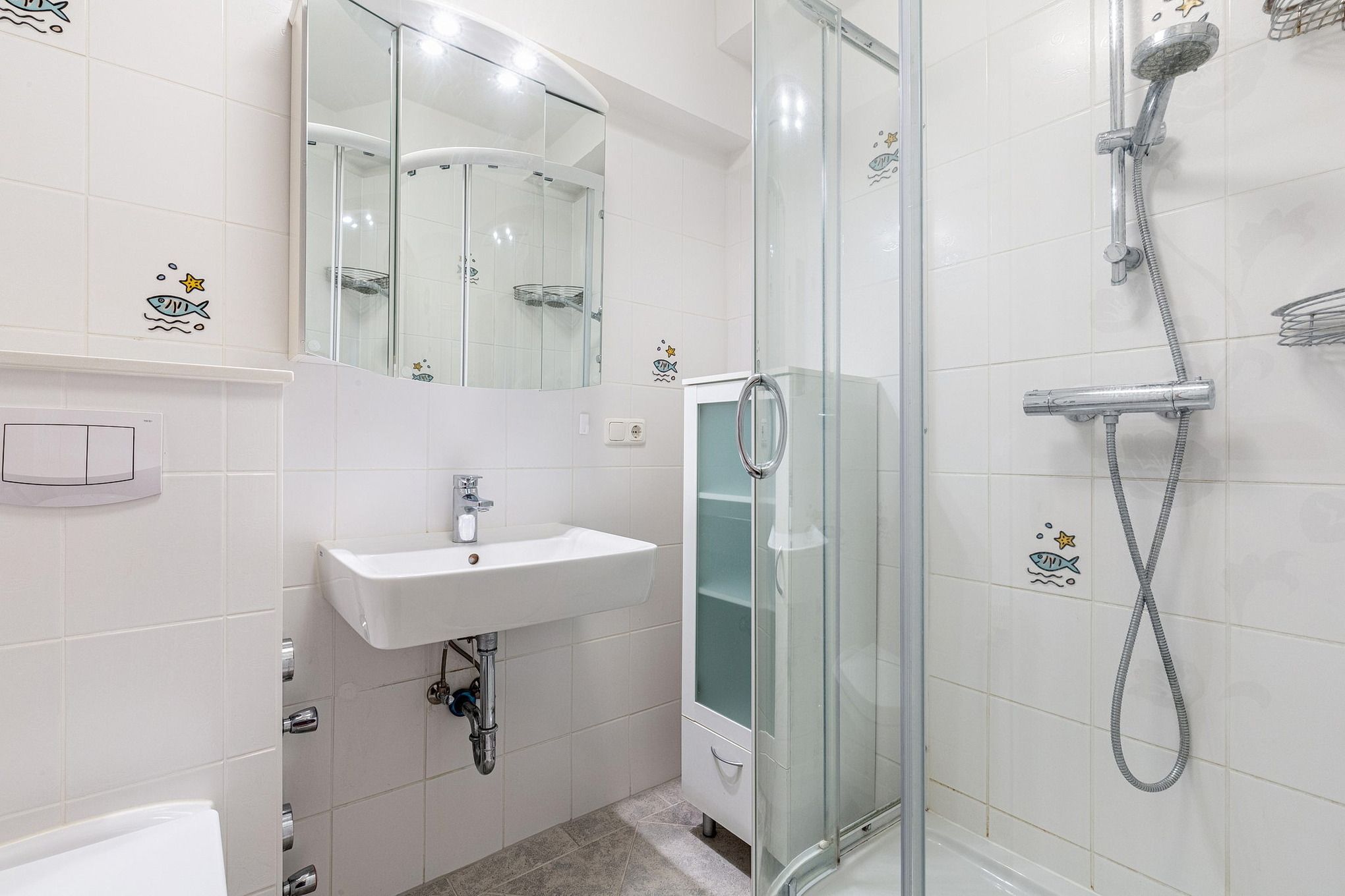 Modernes, hell gefliestes Bad mit Dusche, WC und Waschbecken.