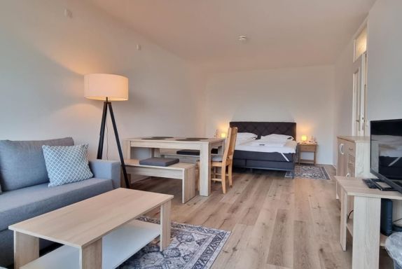 Der Wohn- und Schlafbereich ist offen gestaltet und verfügt über ein bequemes Doppelbett, eine gemütliche Couch, einen Essbereich sowie einen Flachbild-TV. Für die dritte Person steht ein separates Zimmer mit Einzelbett zur Verfügung – ideal als Kinderzimmer oder Rückzugsort für eine mitreisende Person.