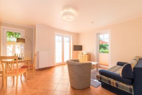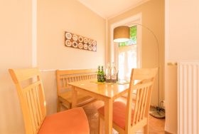 Wohn-/Esszimmer mit hochwertiger Einbauküche (4 Ceranfelder, Kühlschrank mit Eisfach, Herd, Geschirrspüler, Mikrowelle, Wasserkocher, Kaffeemaschine und Toaster) und Essplatz für 4 Personen