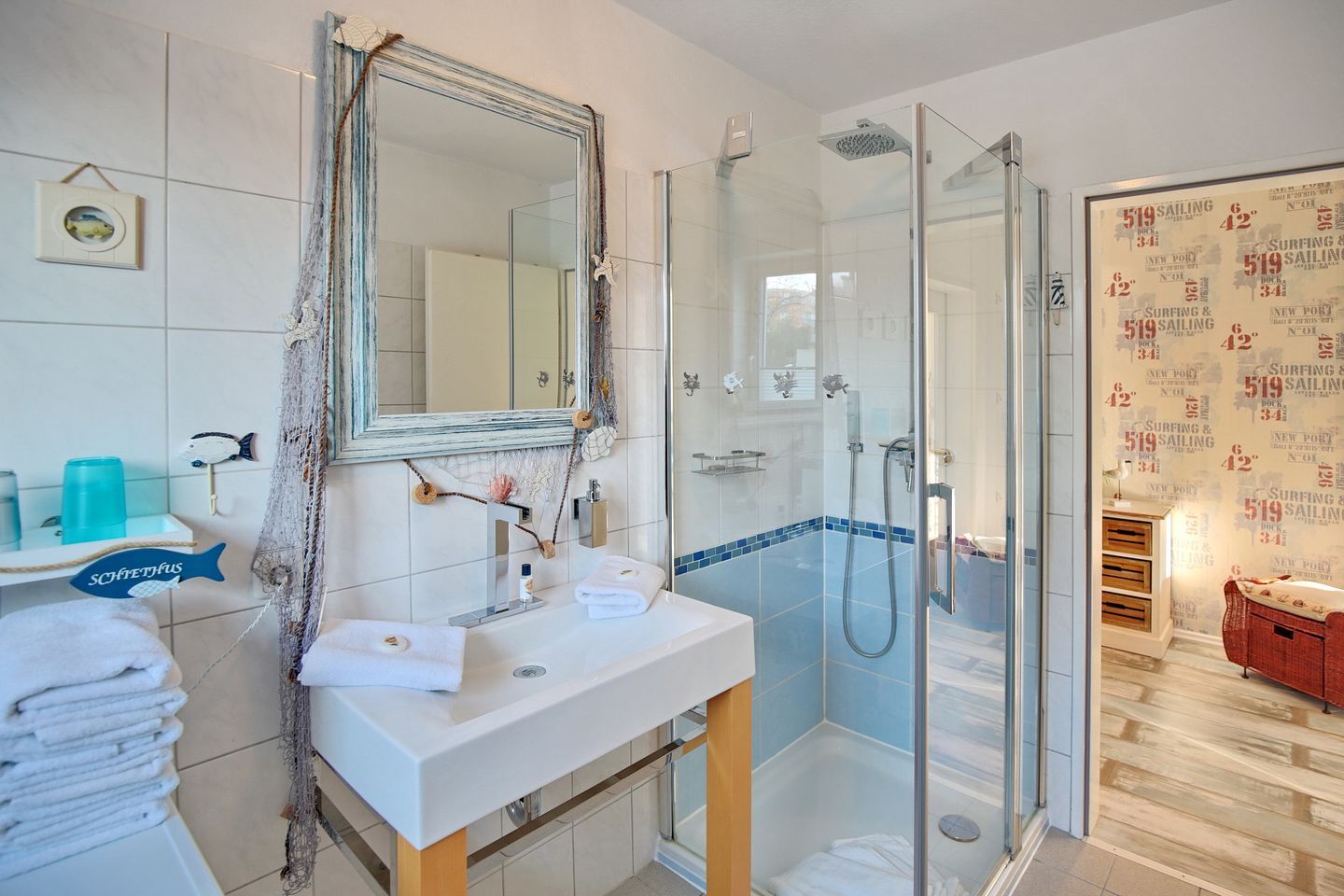 Im Wohnbereich befindet sich ein Flachbildschirm-TV, ein DVD-Player und eine Musikanlage und W-LAN-Zugang. Die Küchenzeile ist modern und verfügt über eine Spülmaschine, einen Kühlschrank mit Gefrierfach, einen Herd, ein Ceranfeld, einen Backofen, eine Mikrowelle, Toaster, Wasserkocher und alles, was man im Urlaub benötigt. Die Schlafzimmer sind jeweils mit einem großen Doppelbett (1,80 m x 2,00 m) und einmal davon mit einem Flachbildschirm ausgestattet. (Hinweis für das Mitbringen der eigenen Bettwäsche, das eine Doppelbett hat getrennte Matratzen das andere Doppelbett hat eine durchgehende Matratze). Damit es beim Schlafen nicht zu hell wird, können Sie in der gesamten Wohnung die Fenster mit Plissees abdunkeln. Das Bad verfügt neben dem Wohlfühlambiente, schöner Regendusche auch über einen Fön und eine Waschmaschine.