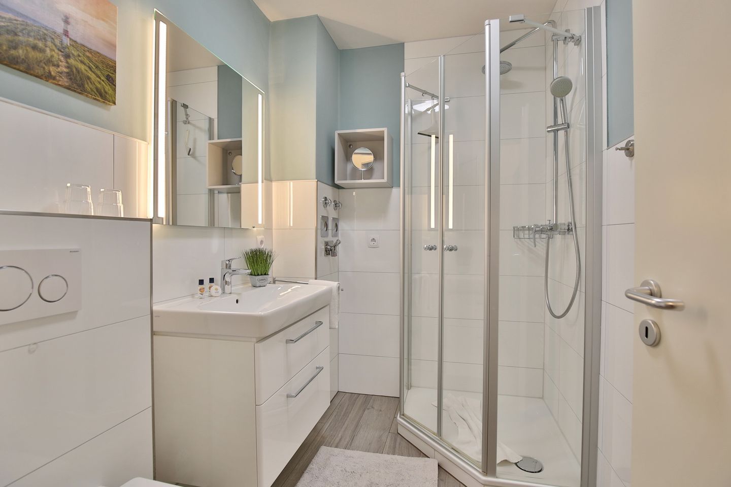 Das moderne Badezimmer mit Dusche/WC verfügt über einen Kosmetikspiegel und Fön.