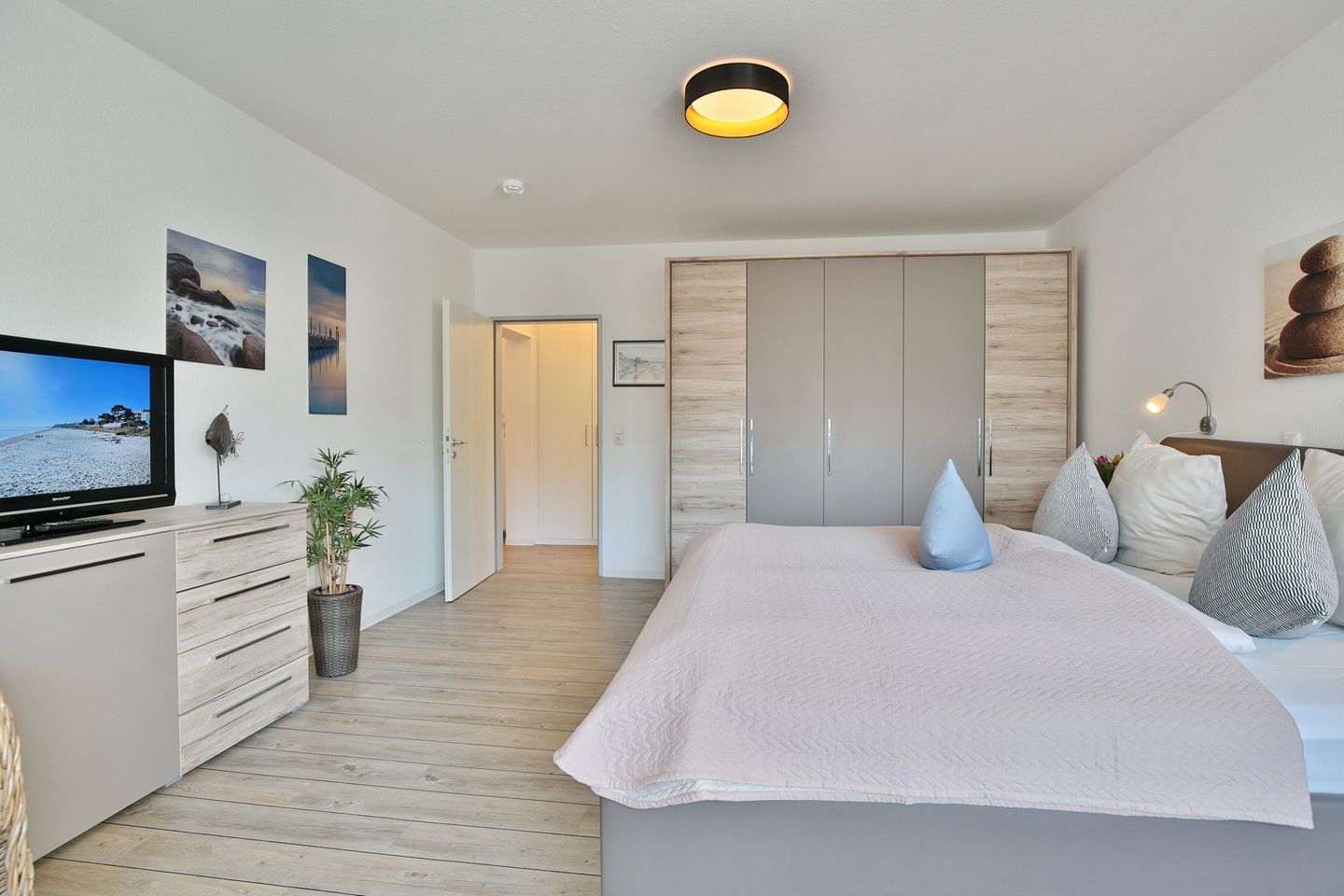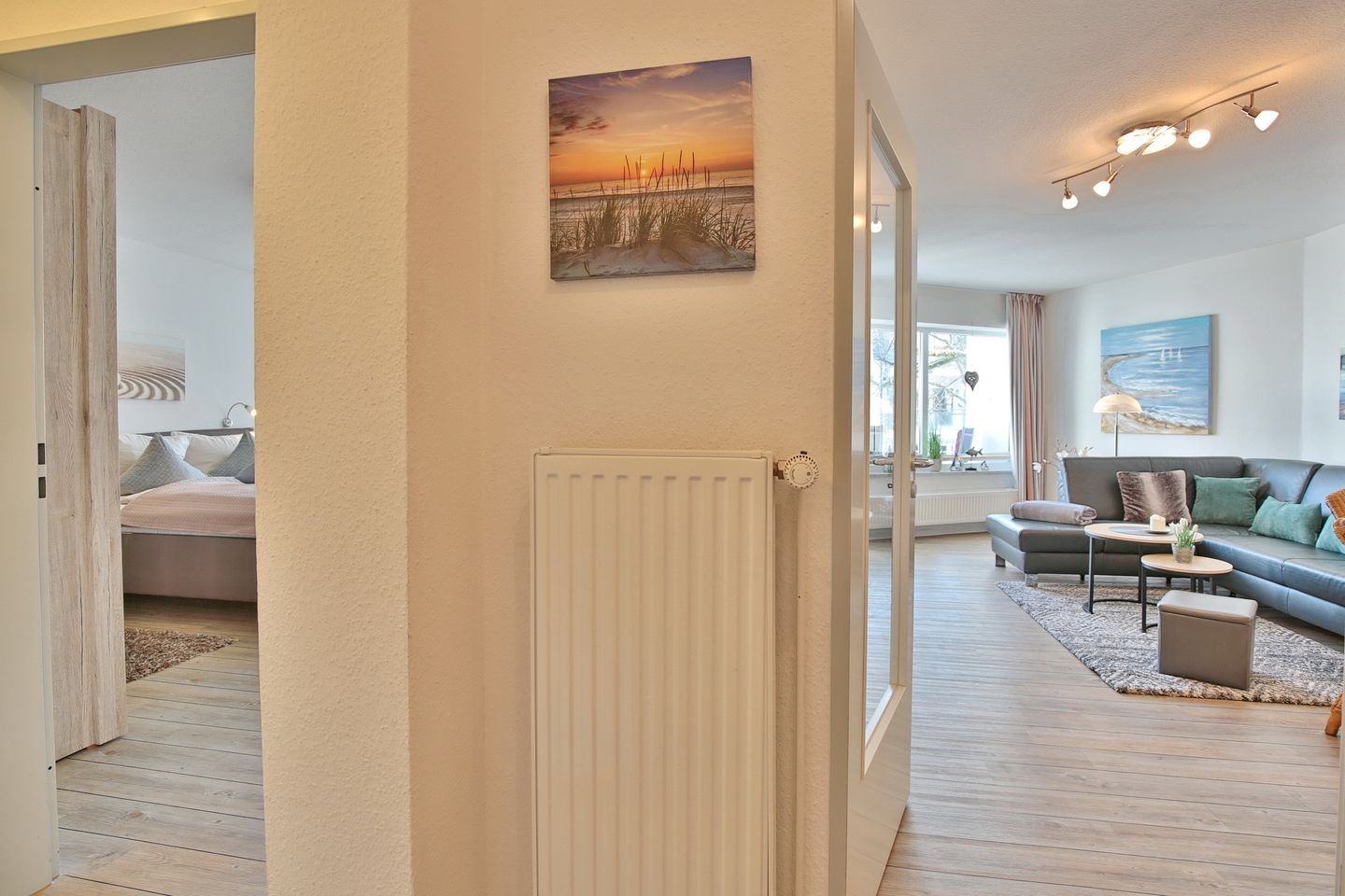 Die Böden sind mit hochwertigem Vinyl-Fußboden in Plankenoptik ausgelegt. Der Wohnessbereich ist modern und geschmackvoll mit Essplatz für 3 Personen ausgestattet und bietet einen Kabel-TV. Das bequeme Schlafsofa im Wohnzimmer bietet eine 3. Schlafmöglichkeit (Liegefläche 1,10m x 2,10m). Die moderne Küchenzeile zeichnet sich durch Spülmaschine, Backofen und Mikrowelle aus. Hier ist auch eine Tassimo Kaffeemaschine zu finden. Der geräumige Schlafraum mit Doppelbett (1,80m x 2,00m) und zweitem TV hat einen Südbalkon mit seitlichem Seeblick.
