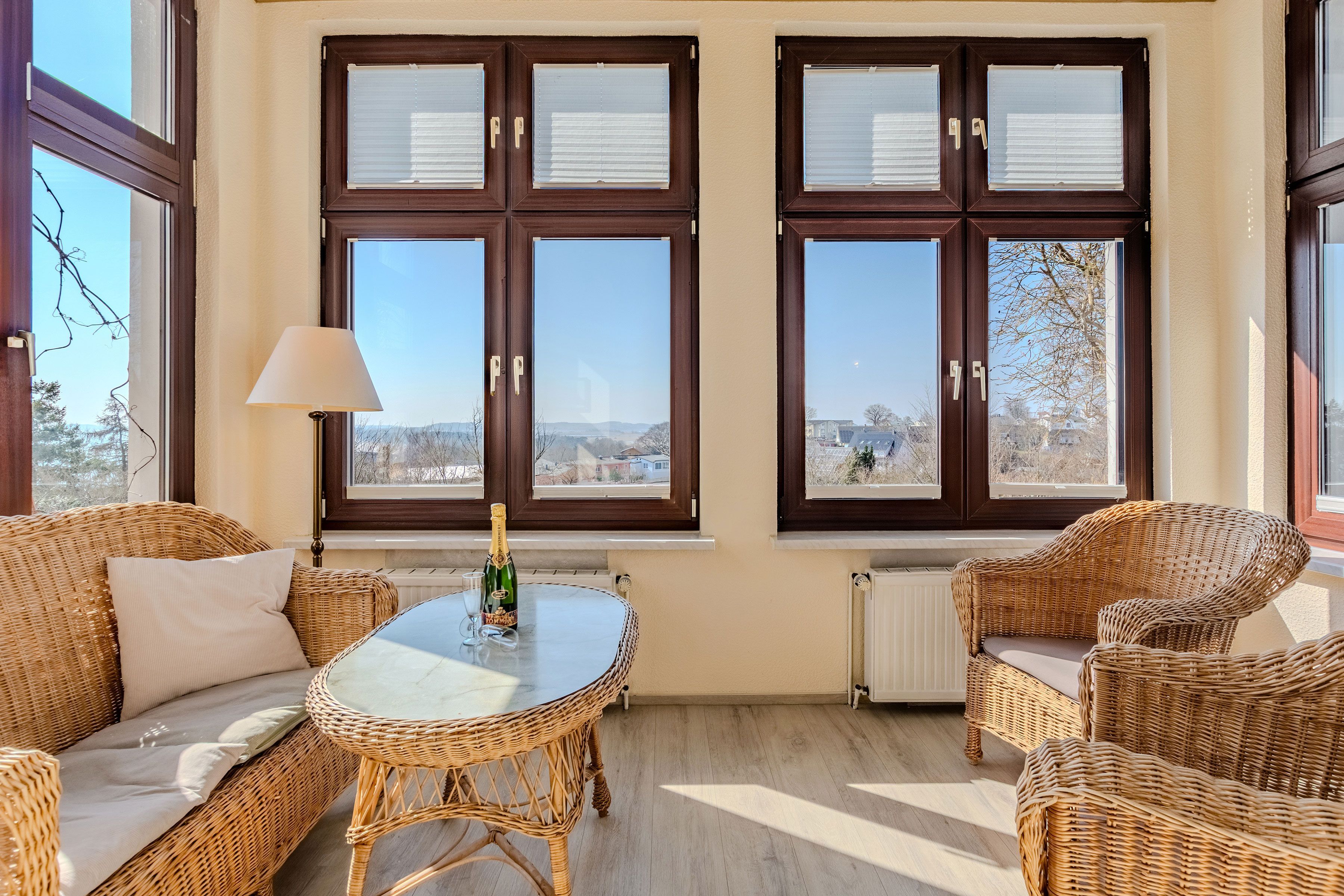 • Verandazimmer mit Korbmöbel, Ostsee- und Mönchgutblick