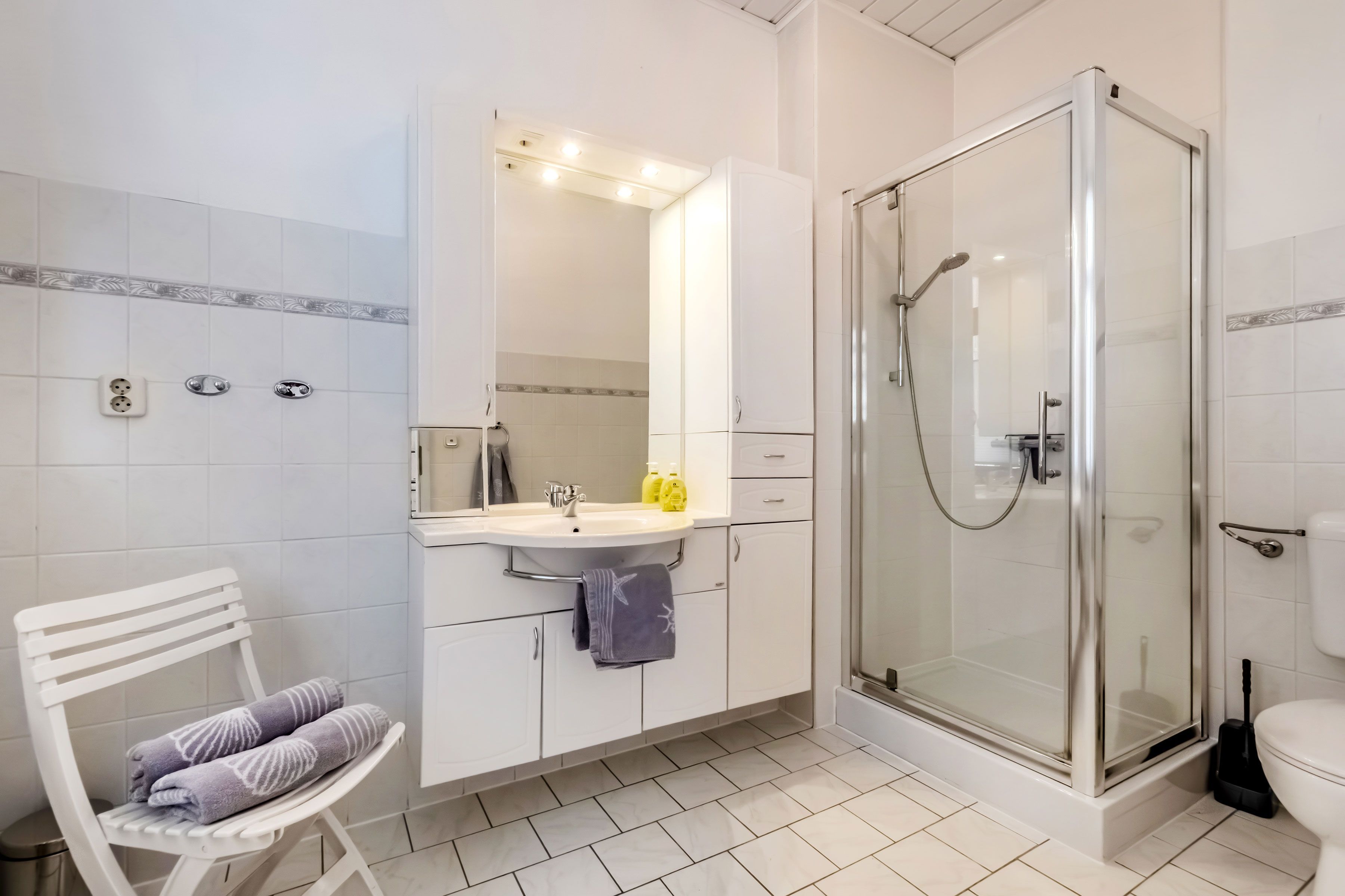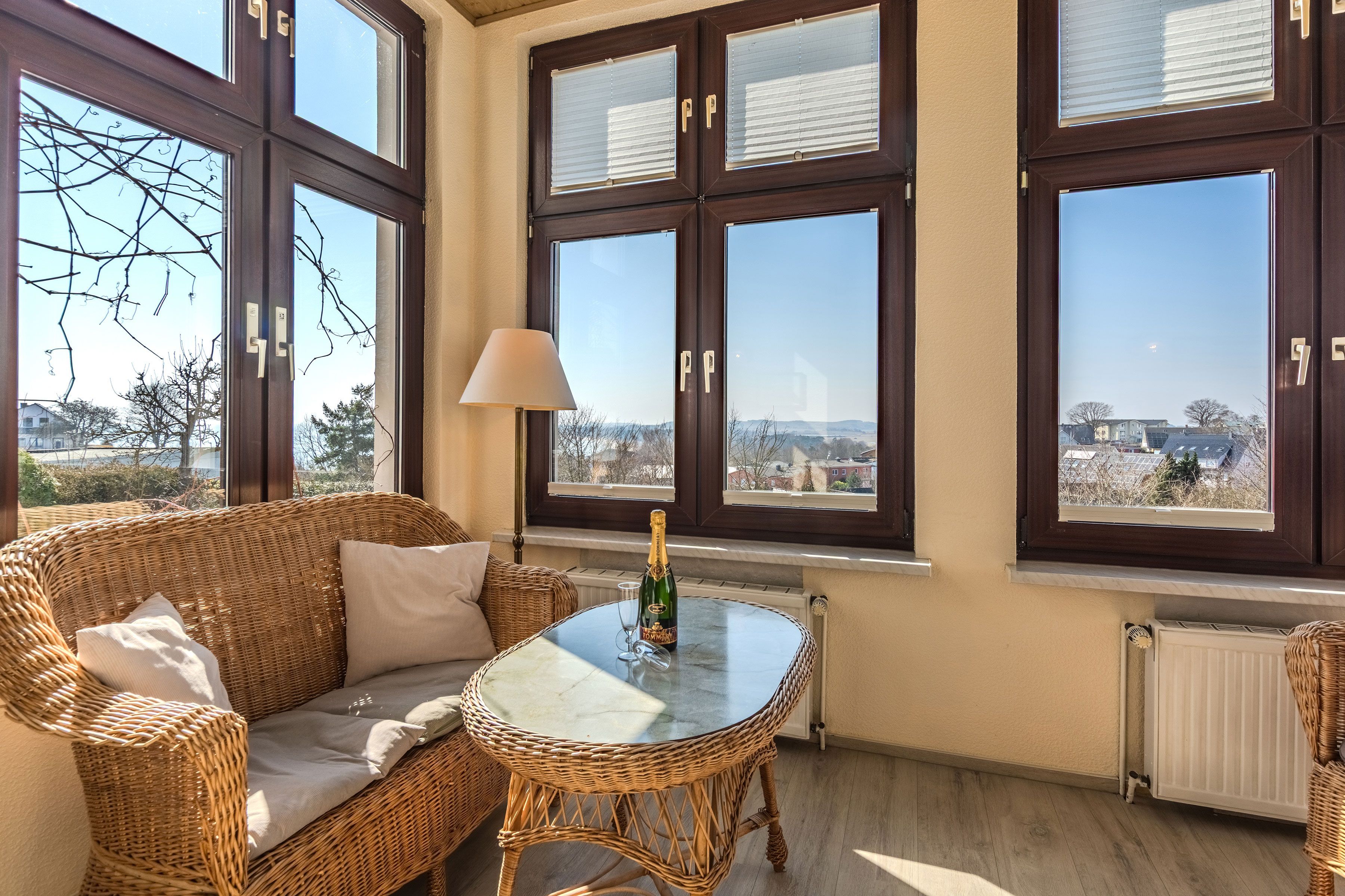 Die Ferienwohnung 1 ist hell und großzügig geschnitten, mit tollem Meeresblick und Terrasse. Eine sehr geräumige und stilvolle Wohnung mit großem Wohnzimmer und gemütlicher Sitzgruppe im Verandazimmer mit Blick auf die Ostsee.