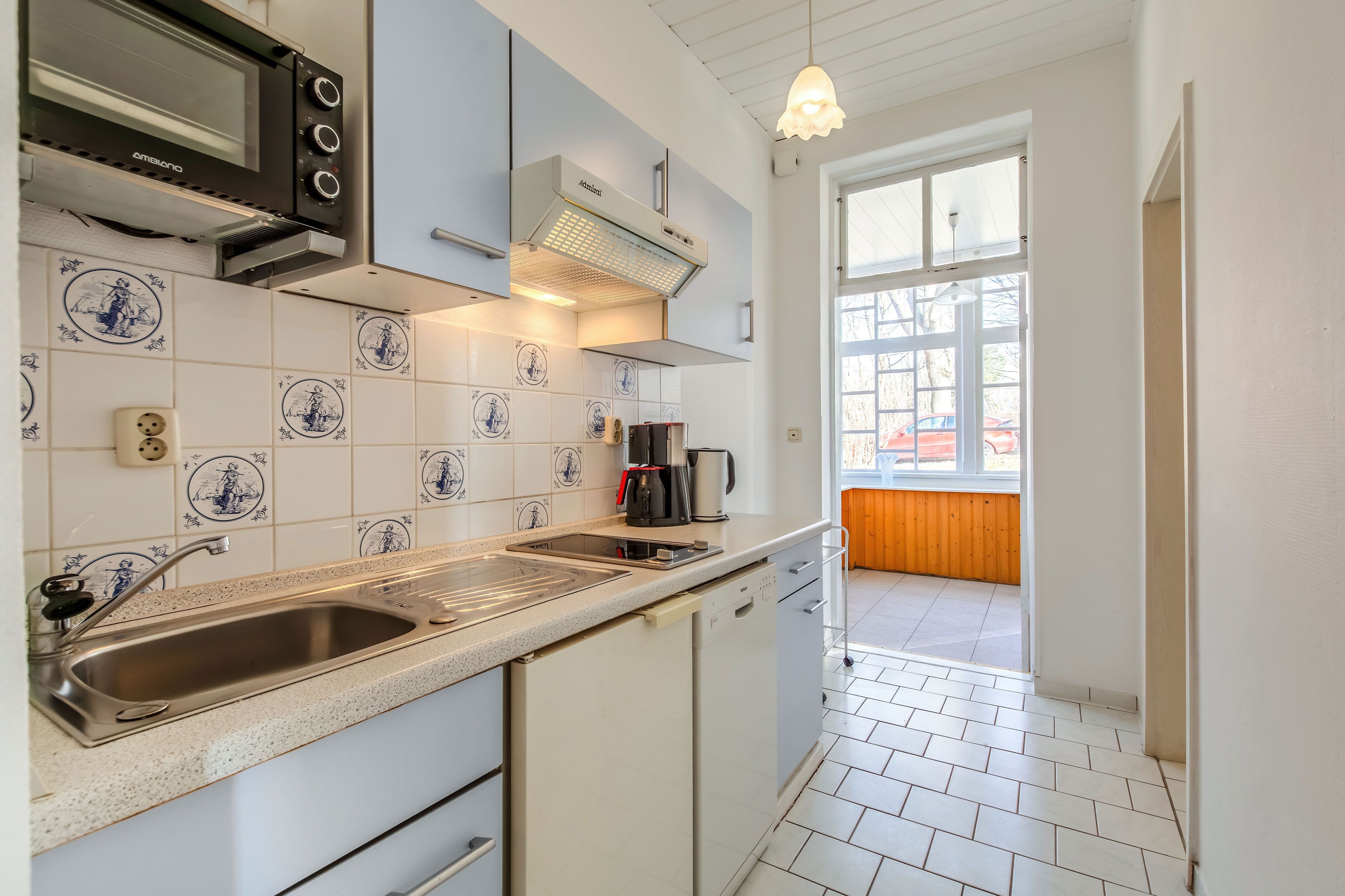 • separate Küche mit 2-Cerankochfeldern, Geschirrpüler, Kühlschrank, Kaffeemaschine, Wasserkocher, Mikrowelle, Geschirr, Gläser, Besteck und Küchenzubehör