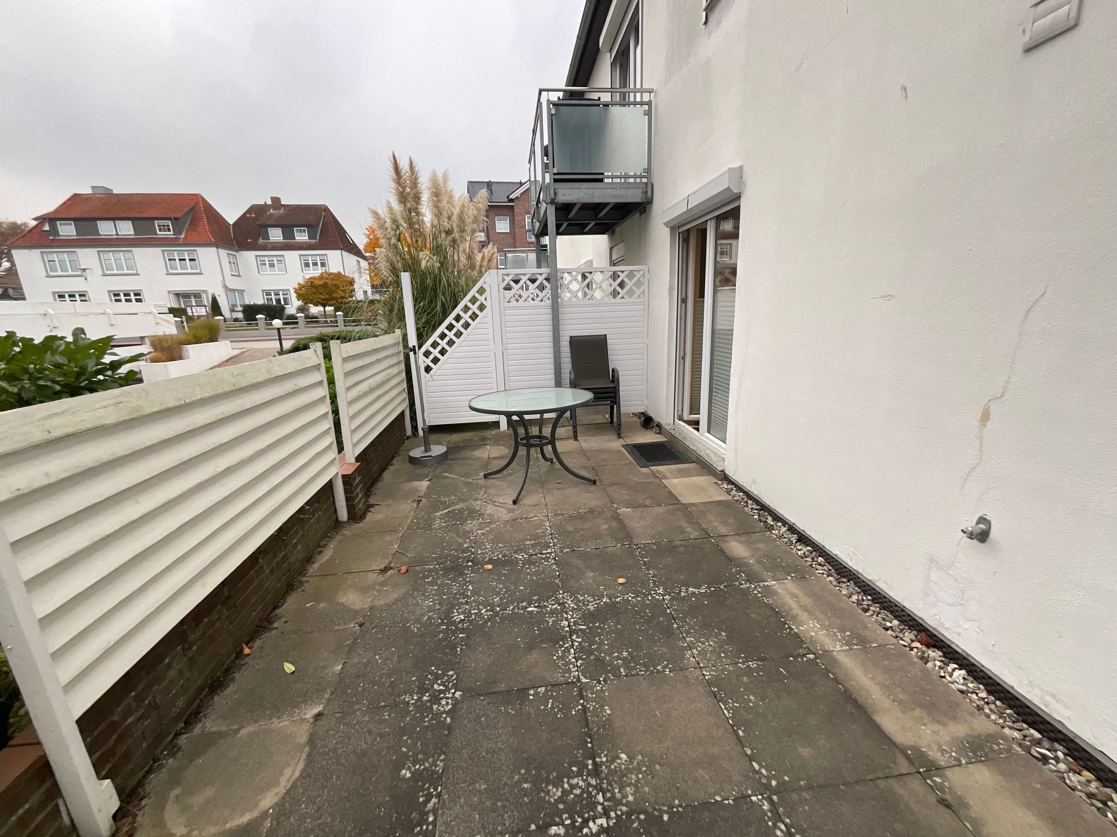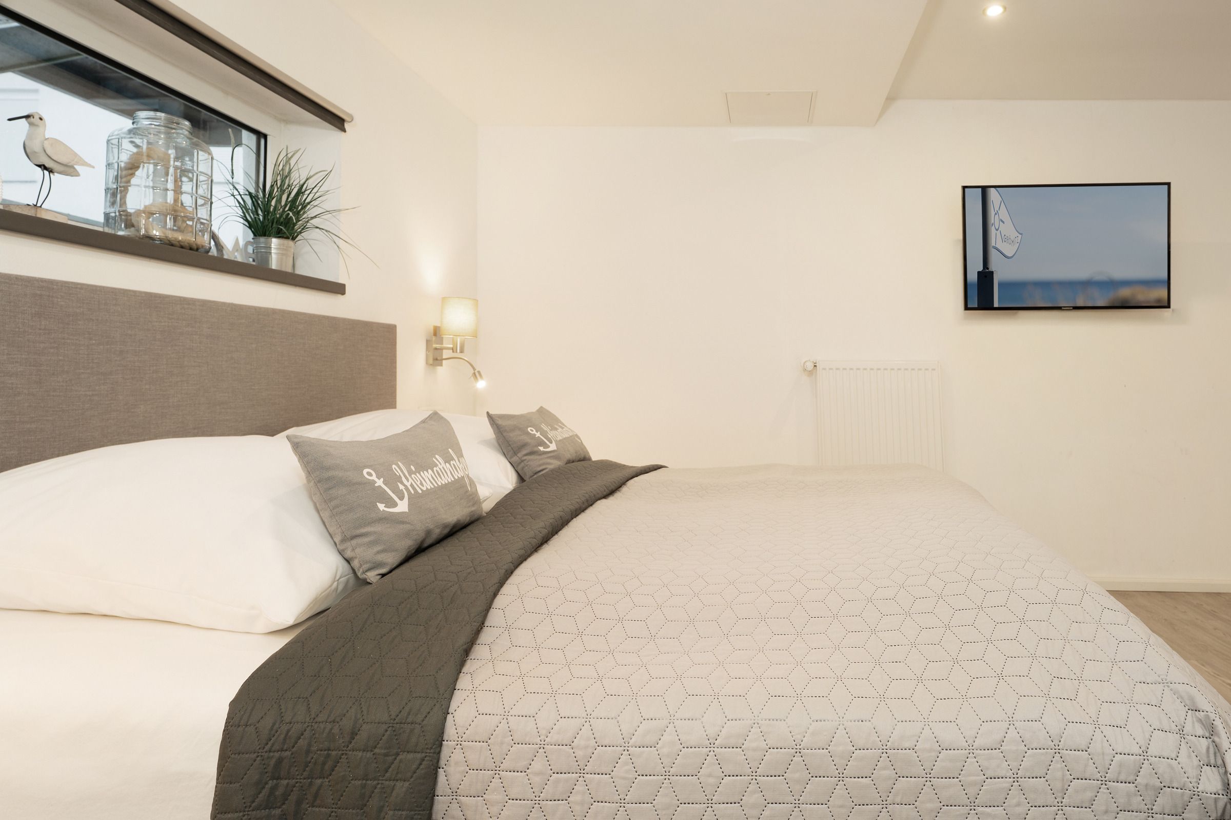 Beim Betreten des hellen Wohnbereichs erwartet Sie eine moderne und gemütliche Atmosphäre mit komfortablem Doppelbett, TV und Radio – ideal zum Entspannen nach einem Tag an der Ostsee. Von hier aus gelangen Sie direkt auf die große, ca. 20 m² umfassende Süd-West-Terrasse, die mit Gartenmöbeln ausgestattet ist und zum Sonnen und Verweilen einlädt. Bitte beachten Sie, dass das Grillen nicht gestattet ist.