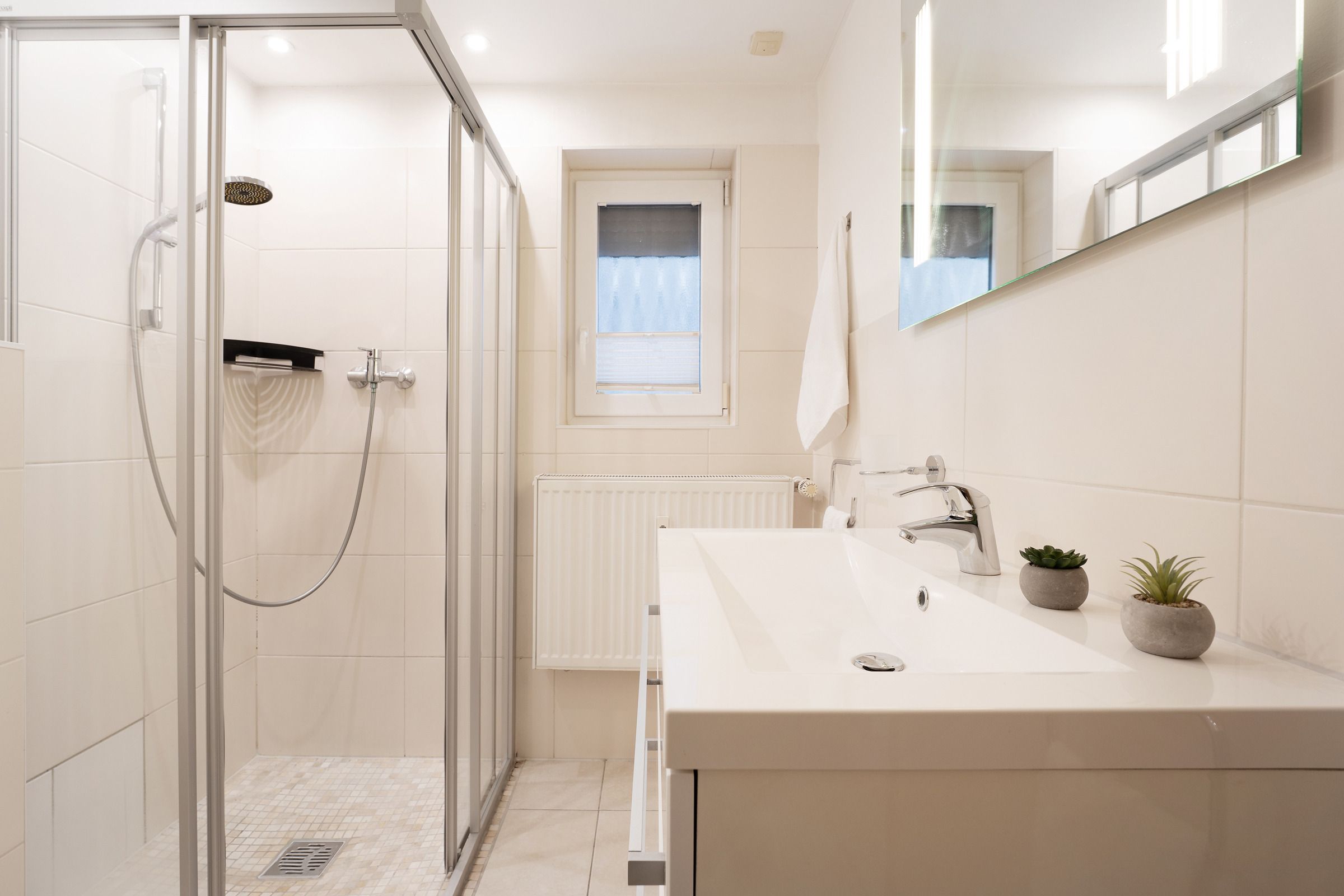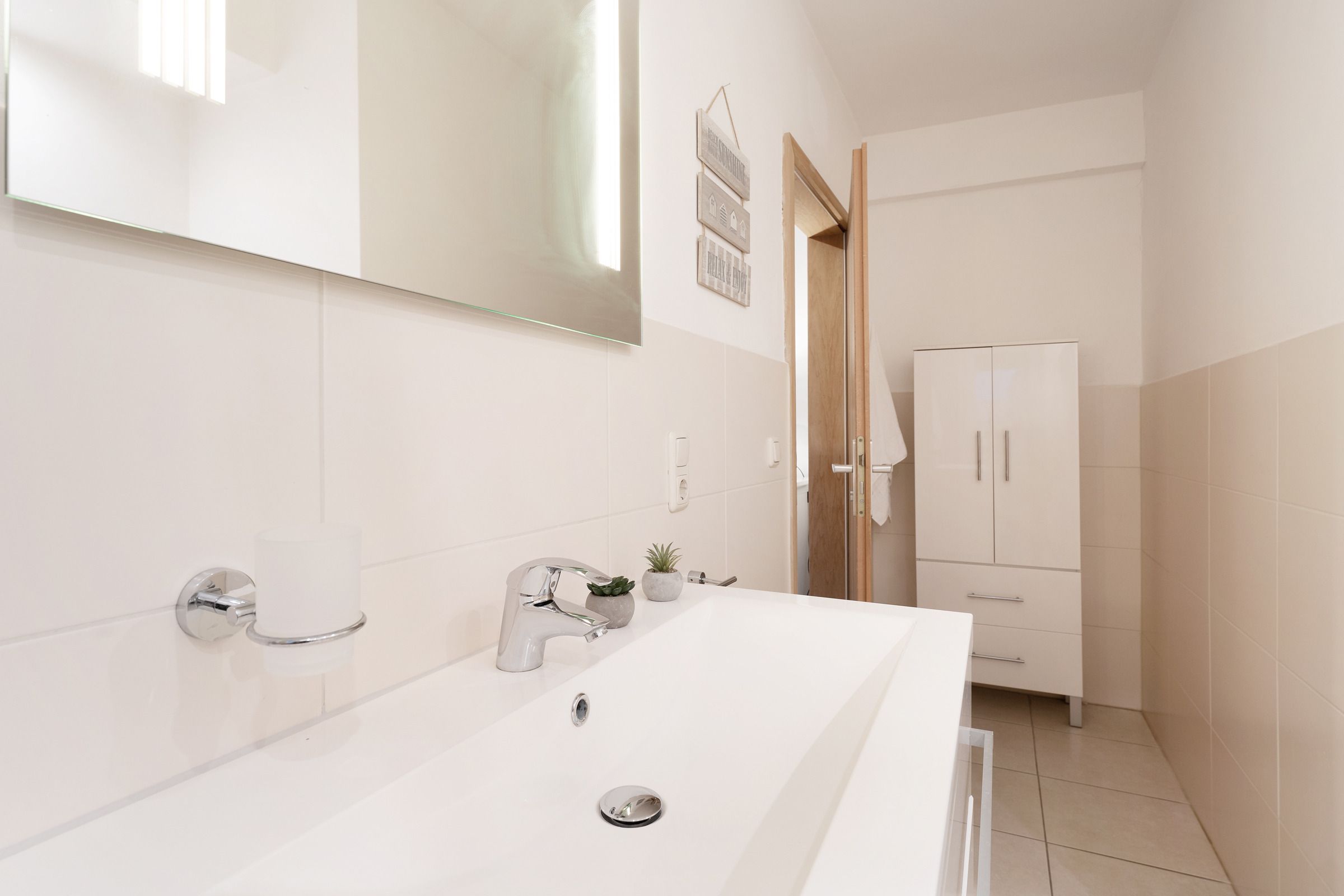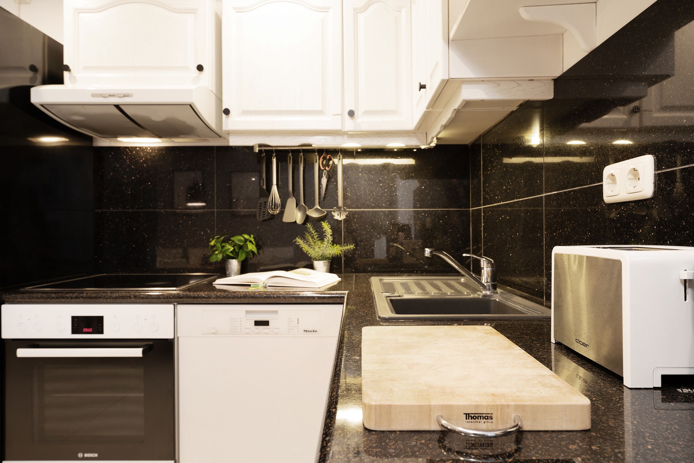 Die angrenzende Küchenzeile ist bestens ausgestattet: Backofen, Geschirrspülmaschine, Wasserkocher, Toaster, Kühlschrank mit Gefrierfach sowie ein Herd mit vier Kochfeldern stehen bereit. Zusätzlich sorgt eine Nespresso-Kapselmaschine sowie eine weitere Kaffeemaschine für perfekten Kaffeegenuss am Morgen.