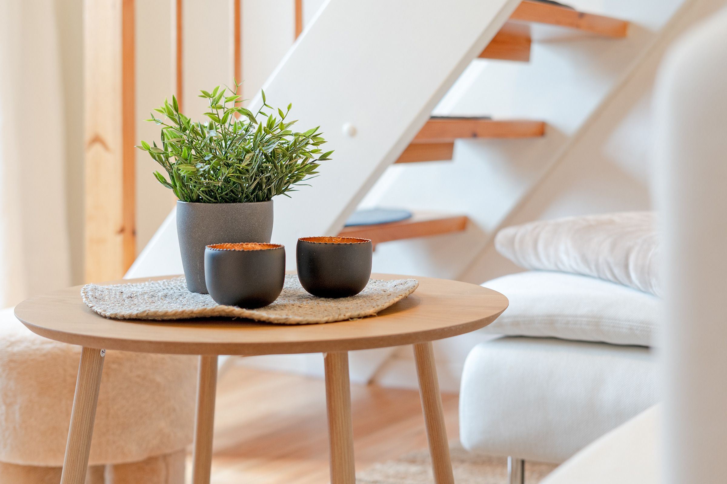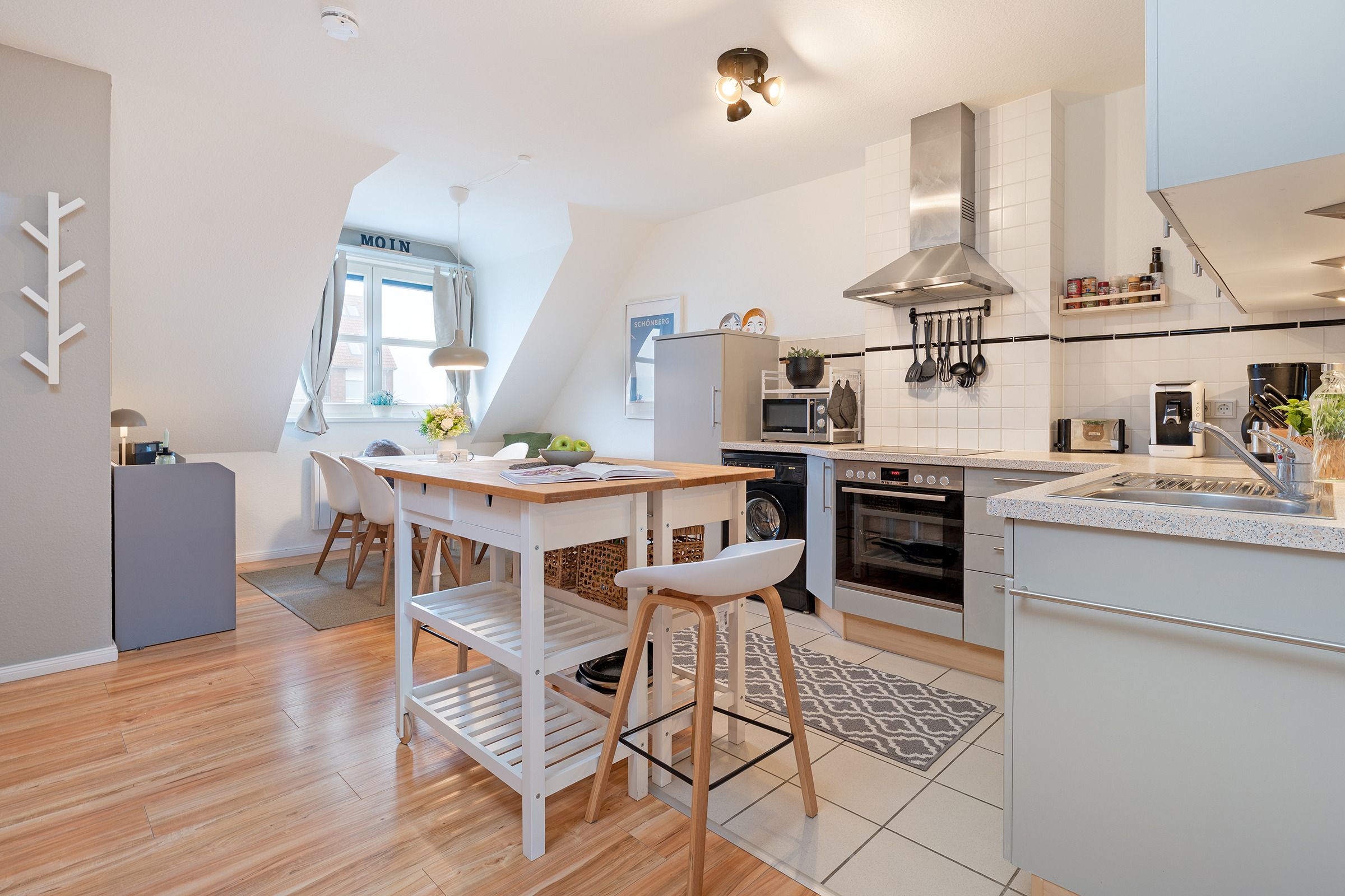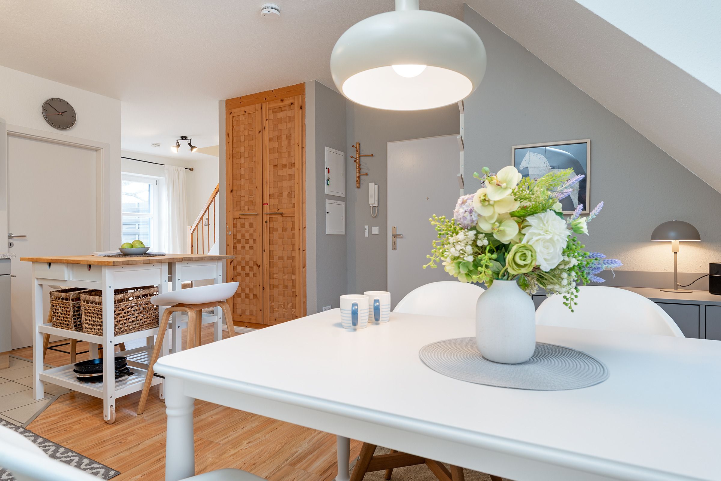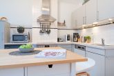 Weiter geht es in die moderne Küche, die mit Backofen, Geschirrspülmaschine, Kühlschrank mit Gefrierfach, Cerankochfeld, Kaffeemaschinen, Wasserkocher und allen wichtigen Küchenutensilien hervorragend ausgestattet ist. Der angrenzende Essbereich lädt zu gemeinsamen Mahlzeiten ein.