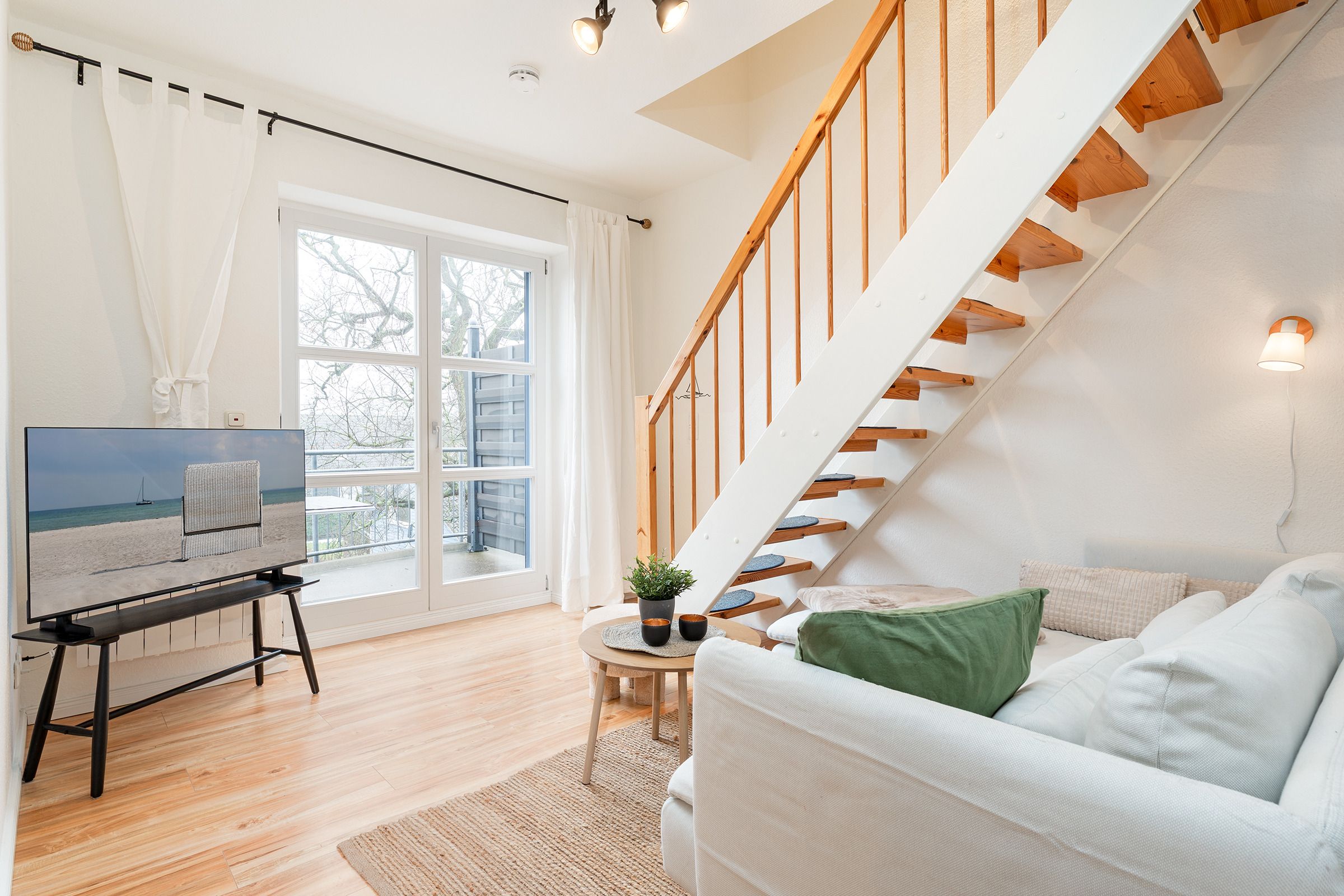 Beim Betreten der gemütlichen Wohnung erwartet Sie ein einladender Wohnbereich, der mit einem Fernseher sowie einer bequemen Sitzgelegenheit ausgestattet ist – perfekt für entspannte Abende nach einem Tag an der Ostsee. Von hier aus gelangen Sie direkt auf den Süd-Balkon, der mit seinen 3 m² Platz für eine kleine Auszeit an der frischen Luft bietet.