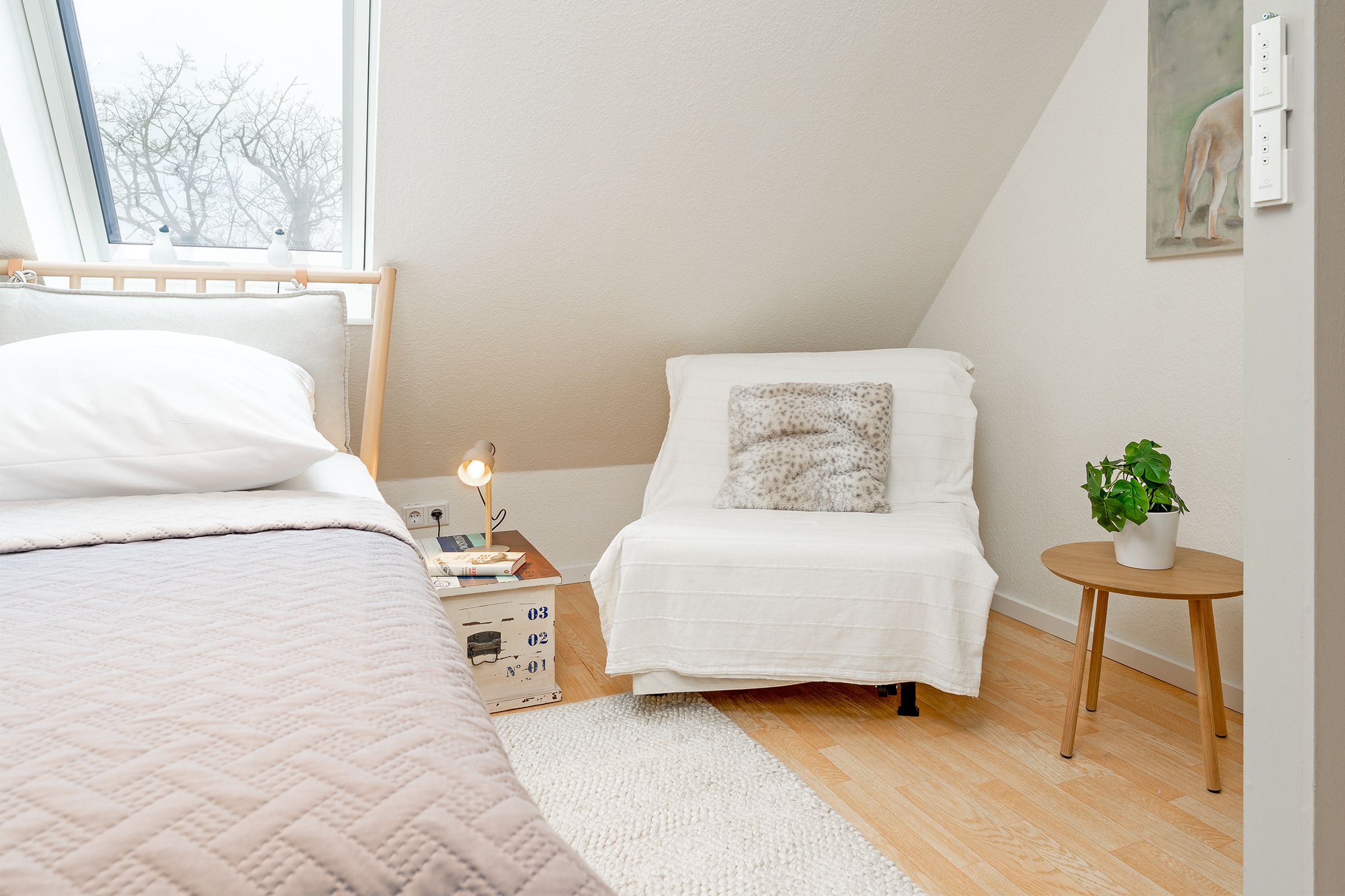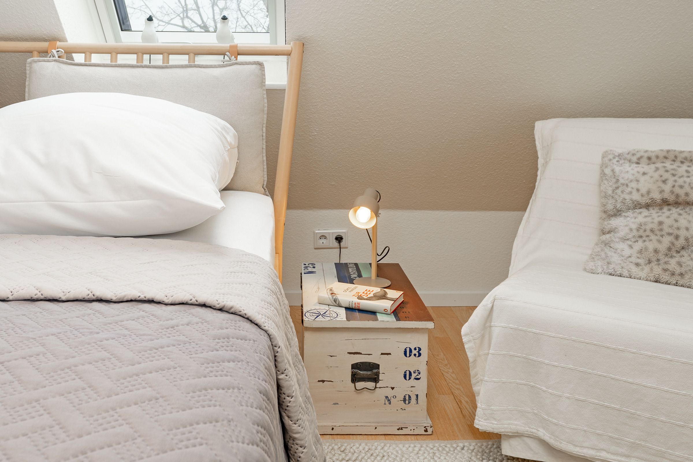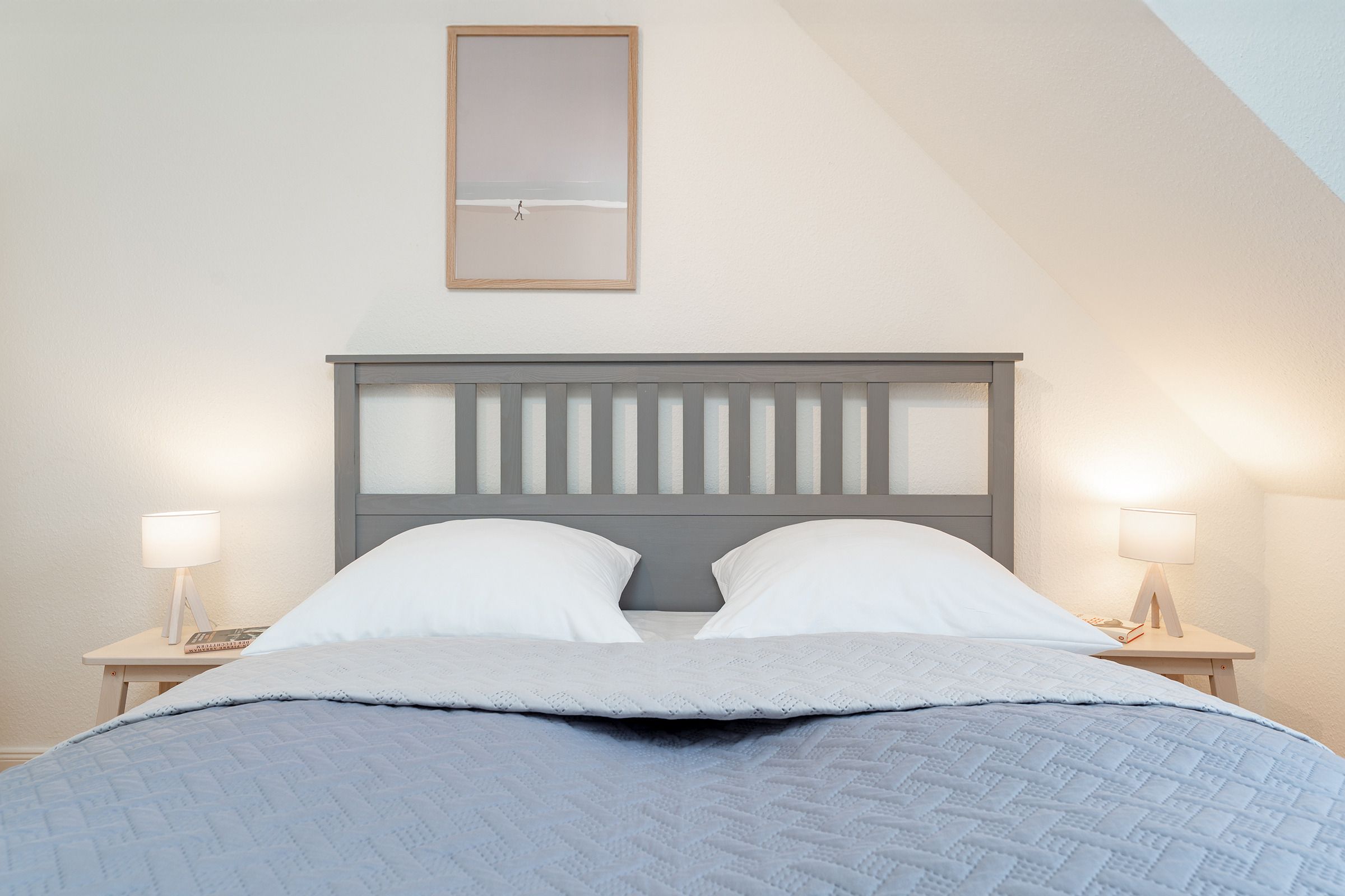Die beiden Schlafzimmer bieten mit einem Doppelbett beziehungsweise einem weiteren Doppelbett und einem Einzelbett erholsame Schlafplätze für die ganze Familie. Verdunklungsmöglichkeiten und Kleiderschränke sorgen für Komfort.