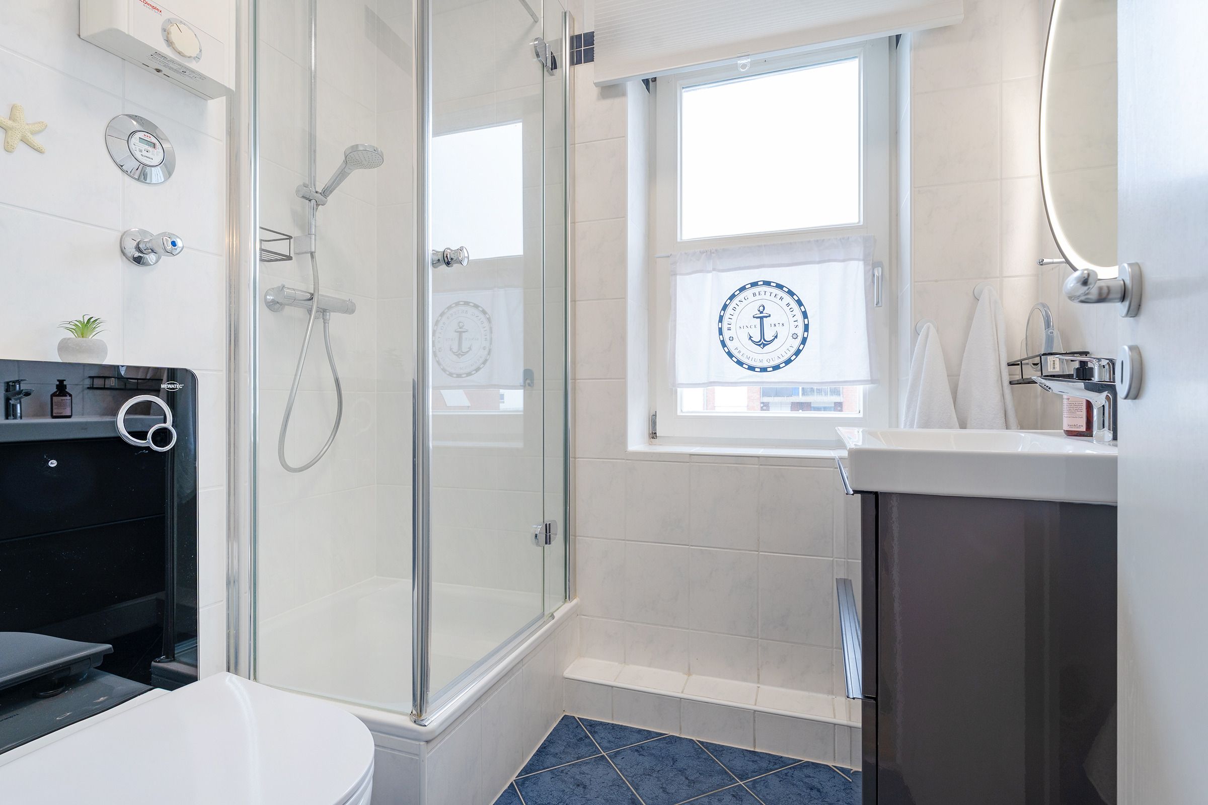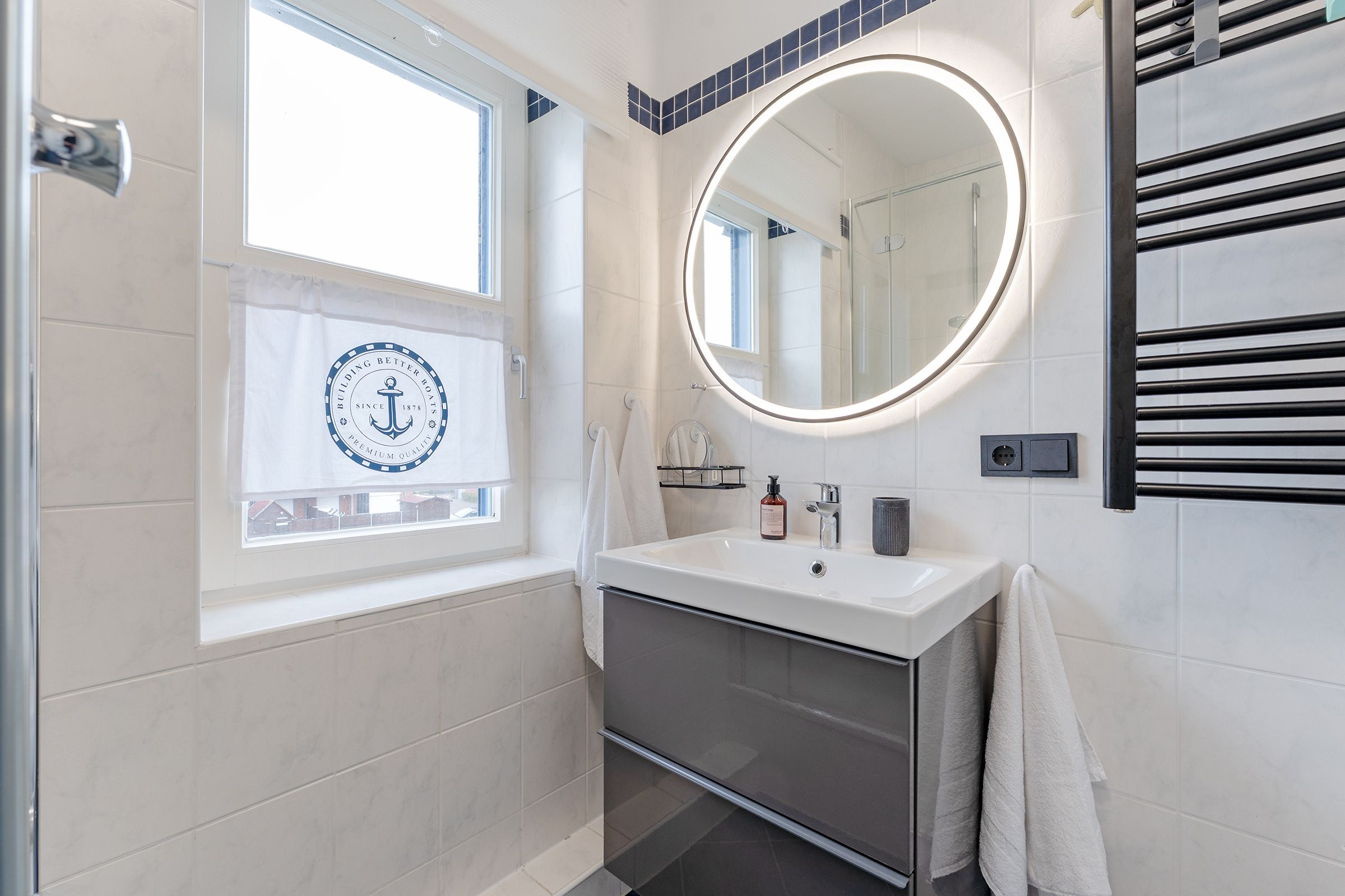 Das helle Badezimmer verfügt über eine bodengleiche Dusche (Einstiegshöhe ca. 30 cm), WC, beheizbaren Handtuchhalter und Haartrockner – alles für einen entspannten Start in den Tag. Zwei Kinderhochstühle und eine Wickelauflage sind vorhanden.