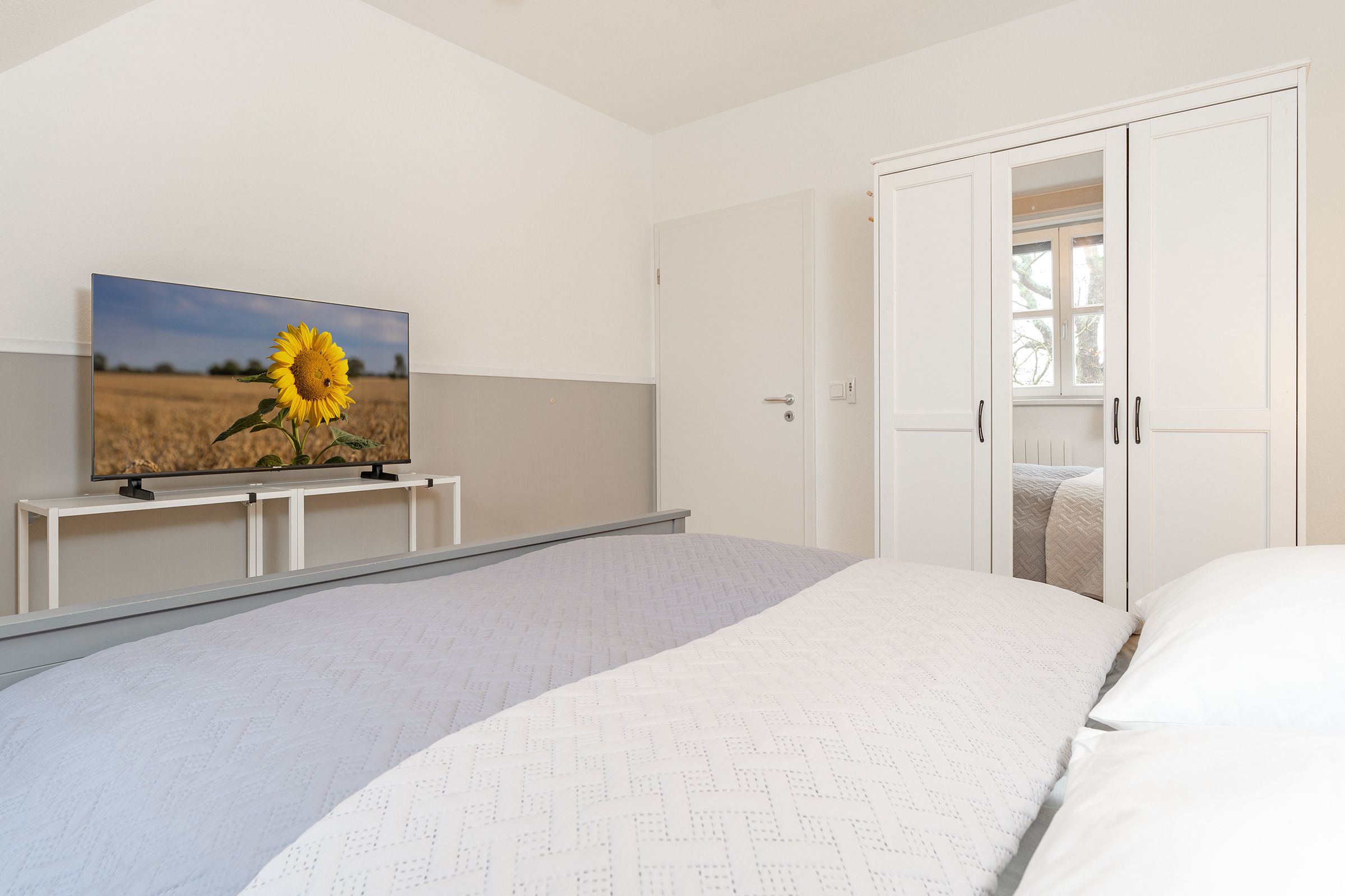 Schlafzimmer 1: 1 Doppelbett (2x 90x200 cm), Kleiderschrank, TV, Verdunkelung: elektrische Außenjalousie, Platz für ein Babybett vorhanden