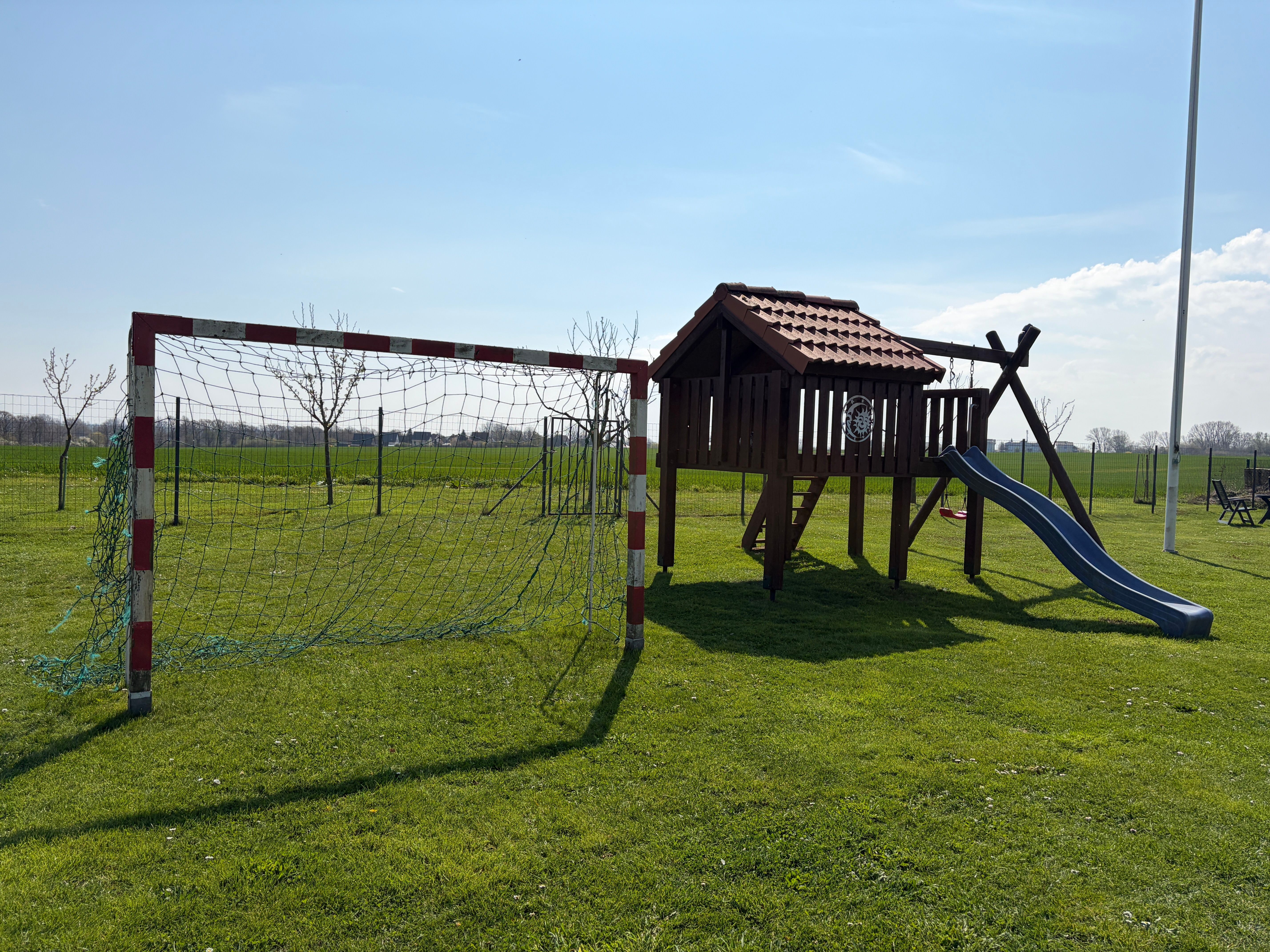 Zur Ausstattung gehören ein kleiner Spielplatz, eine große Spielwiese für Fußball und Federball sowie eine Grillmöglichkeit. Einige Fahrräder stehen kostenlos zur Verfügung.