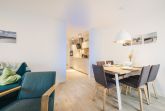 Die voll ausgestattete Küche bietet mit Spülmaschine, Backofen, Cerankochfeld und Mikrowelle alles, was Sie für eine flexible Selbstversorgung benötigen. Direkt vom Wohnbereich aus gelangen Sie auf die private Terrasse – ideal für ein Frühstück im Freien oder ruhige Abendstunden.